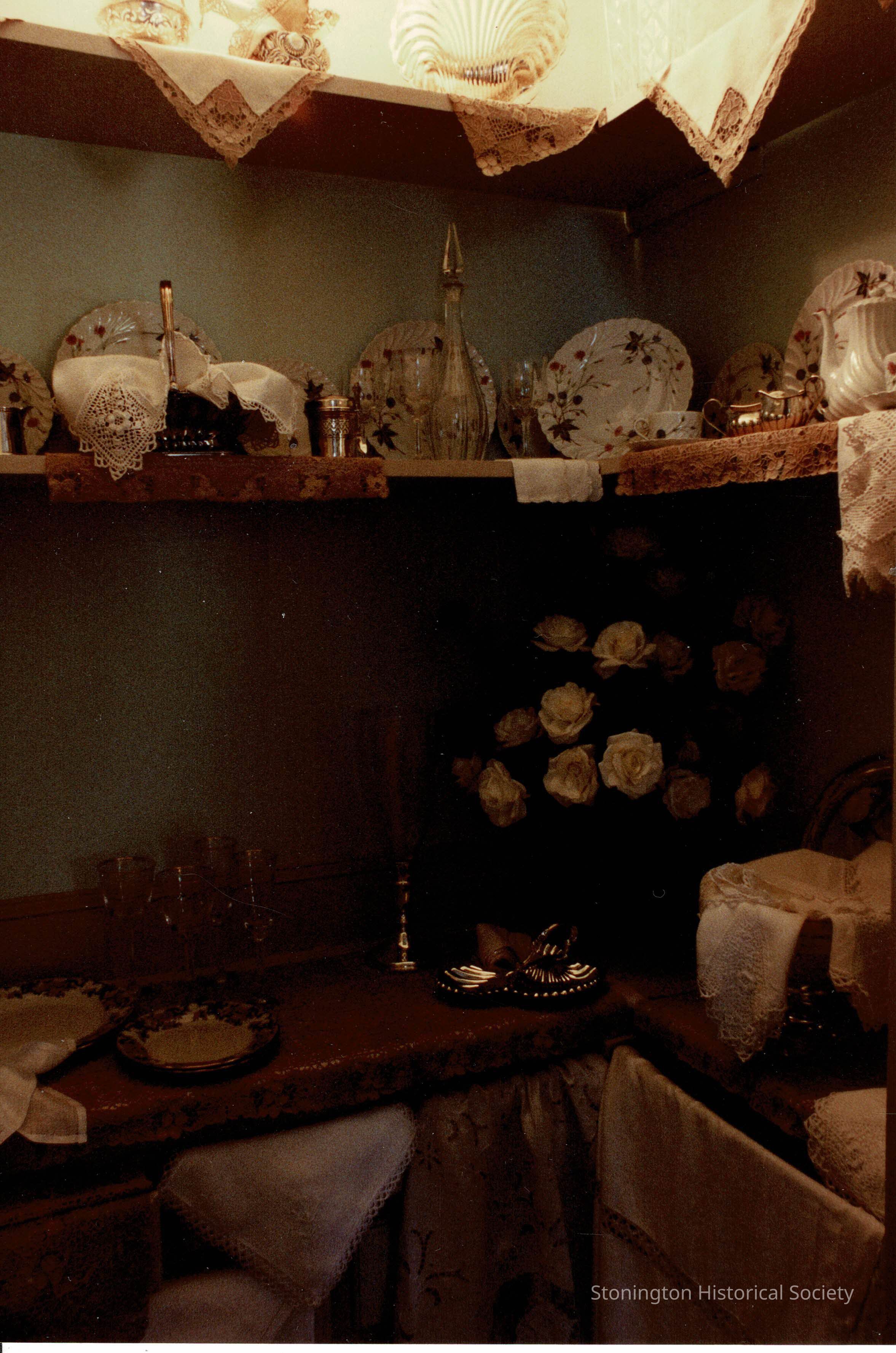 A view inside the china and linen closet off the Captain N.B. Palmer House's dining room, as it was decorated in 1989 for the Designer's Show House. This room, referred to in the program booklet as "Un Petit Espace" was designed by Image D'Europe of Mystic, CT.Collection