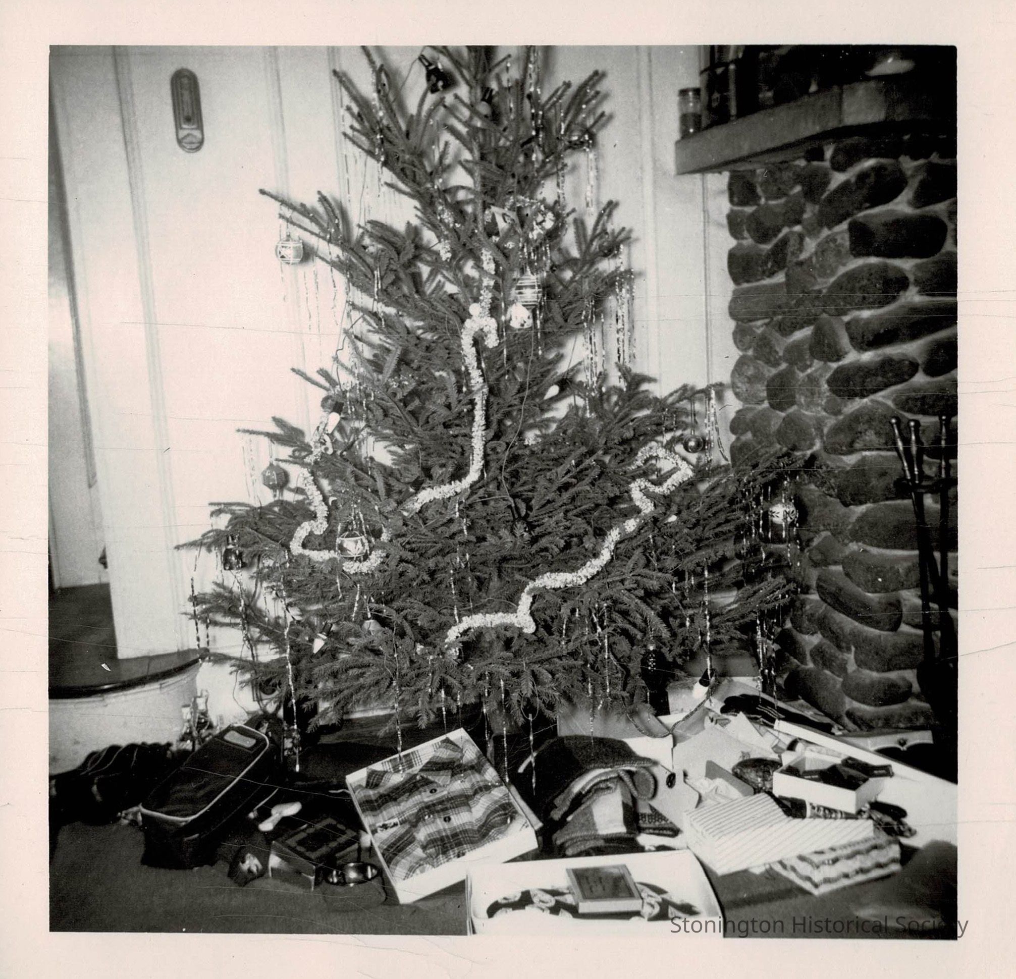 Undated photograph of a Christmas tree in the Burrows and Mildred Perry home at 101 Main Street. Most likely dates from late 1930s or 1940s. Burrows and Mildred raised three children in this home: Martha, Andrew "Andy", and Ella.Collection