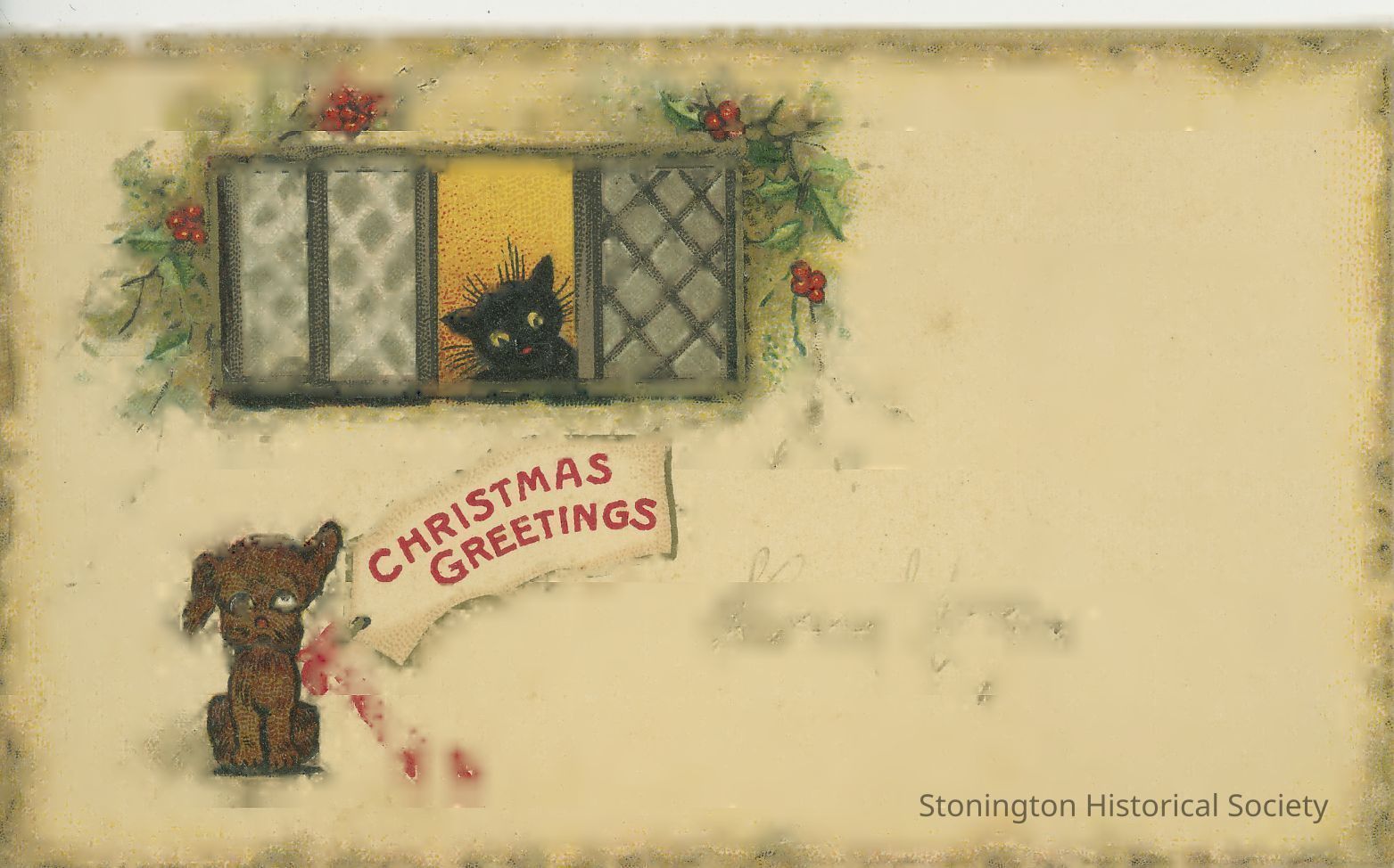 Dog with red bow with greeting, cat at window looking out