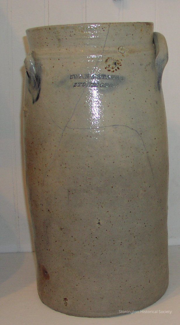 Tall, cylindrical stoneware churn stamped "SWAN & STATES / STONINGTON." The churn is gray with blue glaze over the maker's mark and the handles. Blue glaze is also in the back in an unknown shapeCollection