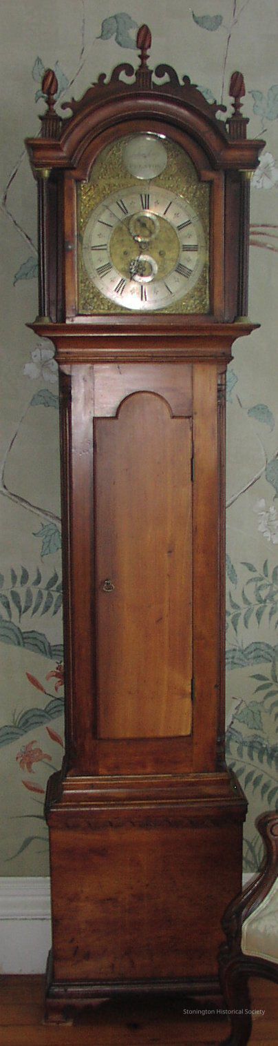 Eight-day tall clock made by John Avery of Preston, CT c. 1770. Cherry case in "Norwich" style featuring "whales tails" fretwork along hood. Face/dial: cast spandrels, separate silvered chapter, calendar, & minute rings. Separate calendar ring instead of the usual "Window."Collection