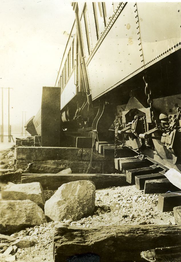 Close up of derailed train on causeway