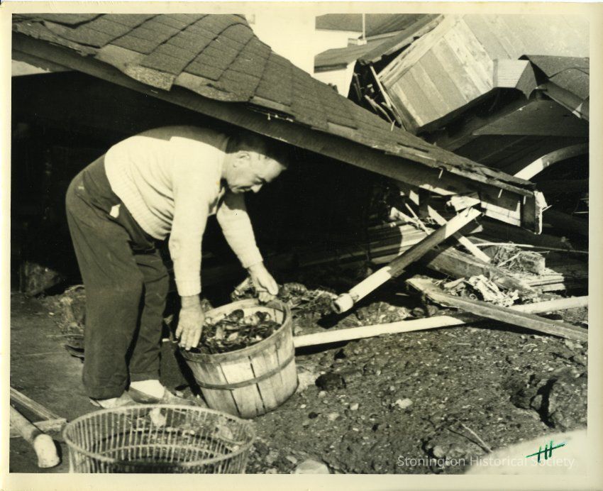 Close-up of man working on debris of demolished house with baskets used for collecting various items