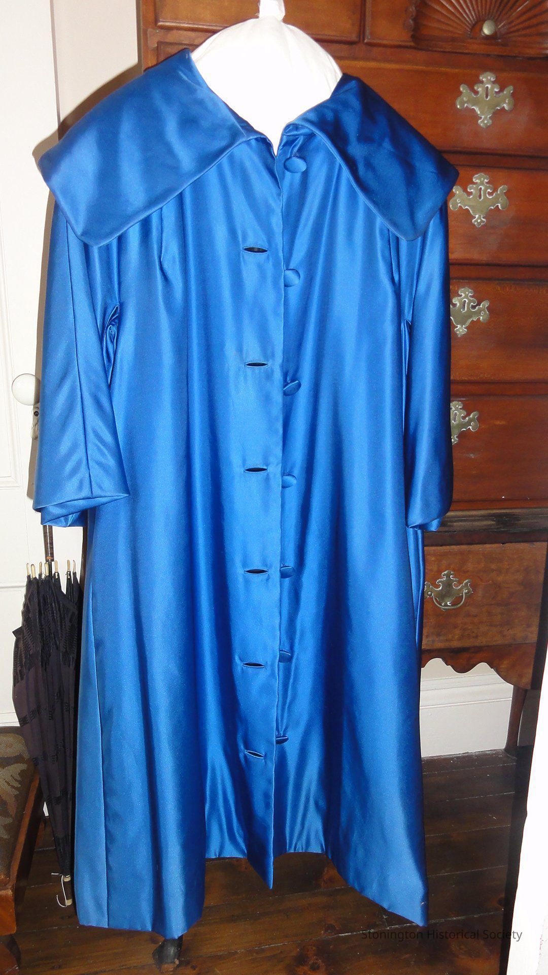 Bright blue satin evening coat,wide3/4 raglan sleeve, 9 inch round collar fully lines with black taffeta