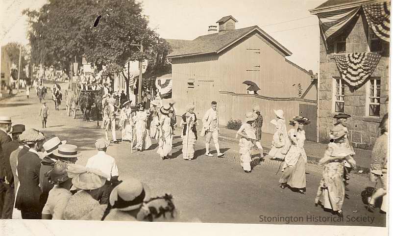 Women marching in parade on Elm Street during Celebration of the Battle of Stonington, 1914. Titled on back as "Colonial Days in Stonington"