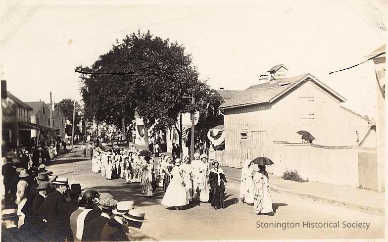 Group of people, mostly women, in costume in parade on Elm Street during Celebration of the Battle of Stonington, 1914.