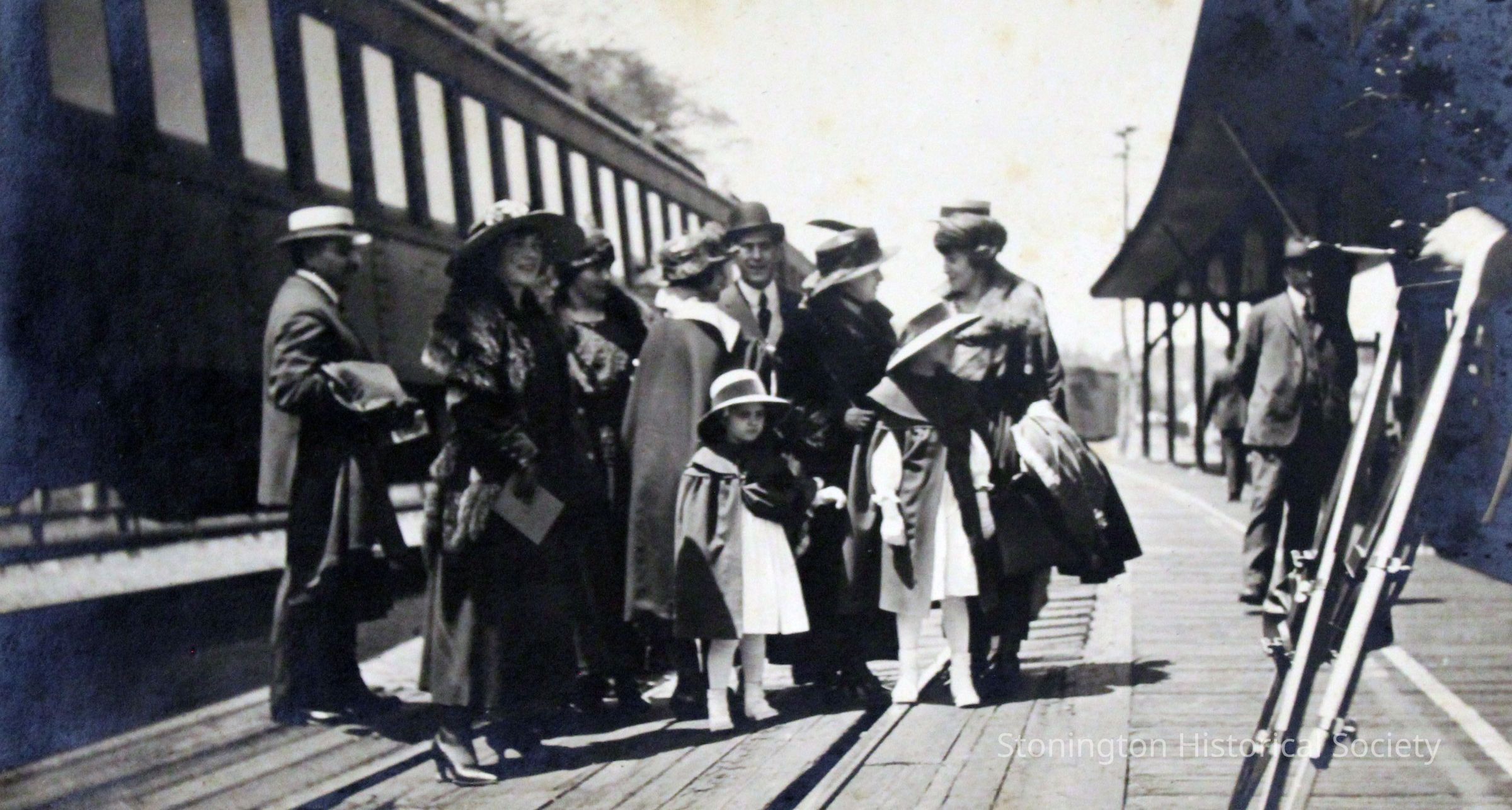 Women and children disembarking from the train at Stonington station, most likely for the launching of the SS Lansing from the Stonington docks on May 20, 1919. The young woman in the large hat closest to the photographer may be Dorothy Mercadante, daughter of the Nafra Company founder, Joseph Mercadante, who was charged with blessing the ship before her launch. The other people may be members of the Ship Construction and Trading Company, and their families, or other employees of the Nafra Company. The Lansing steamship was rebuilt by the Ship Construction and Trading Company, Inc. of Stonington for the Nafra Company of New York.Made/Created