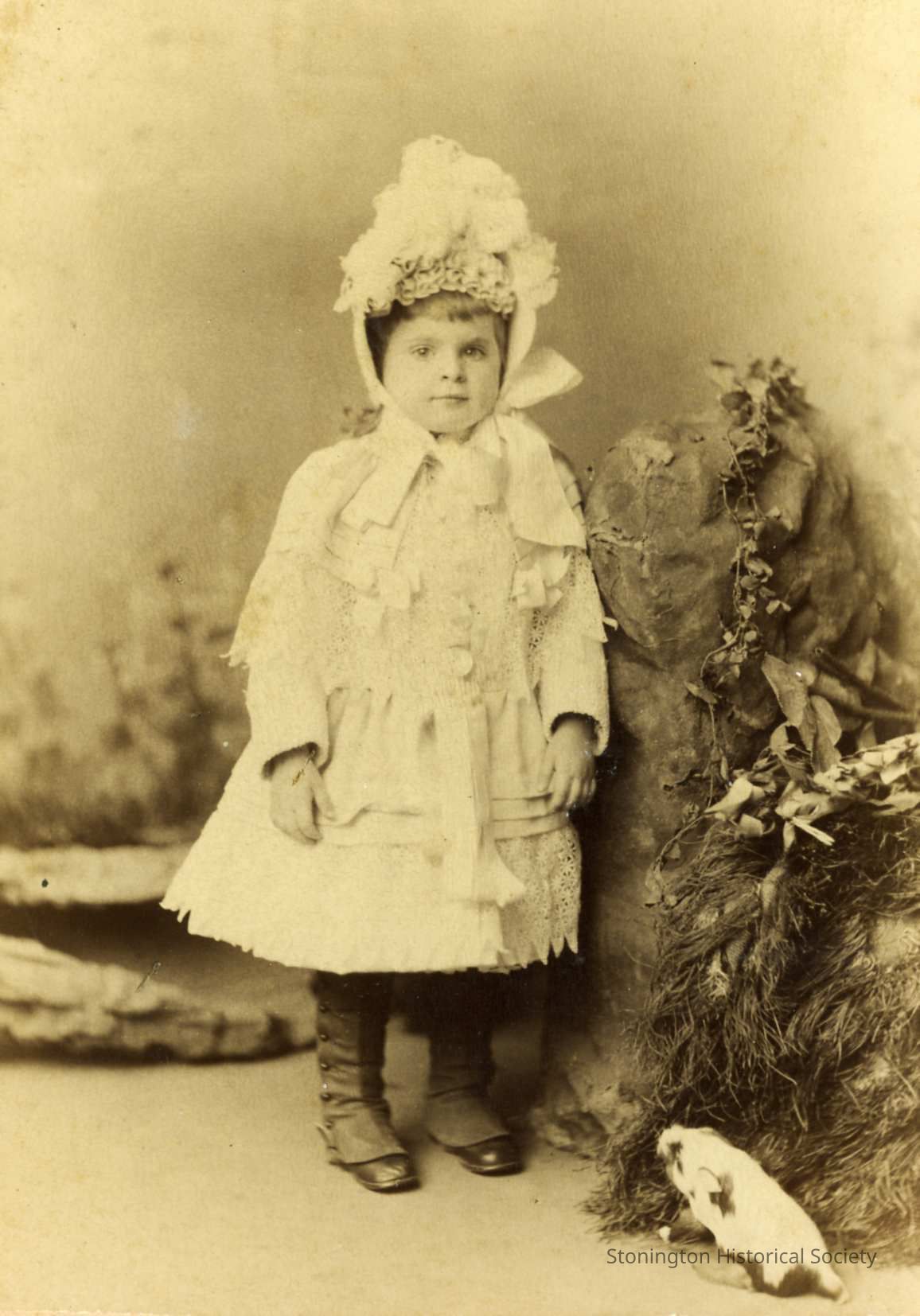 In this photograph, Constance is wearing a light colored dress and bonnet. There is a small animal in the right corner of the photograph, and she is standing beside some photography props and background.Collection