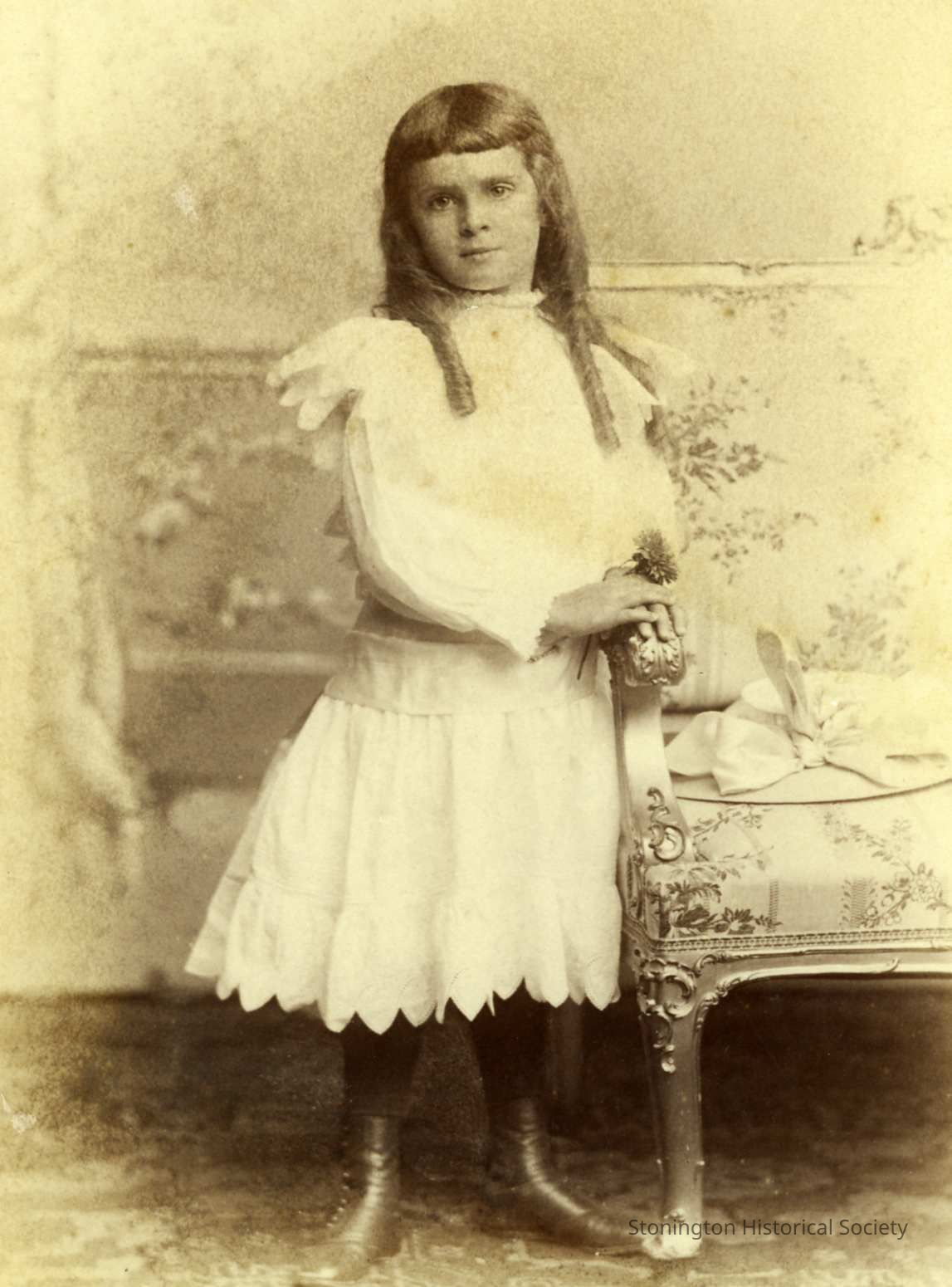 In this photograph she is wearing a light colored dress with black stockings and shoes. Her hair is down and over her shoulders. She is standing beside a floral settee with a flower in her hand.Collection