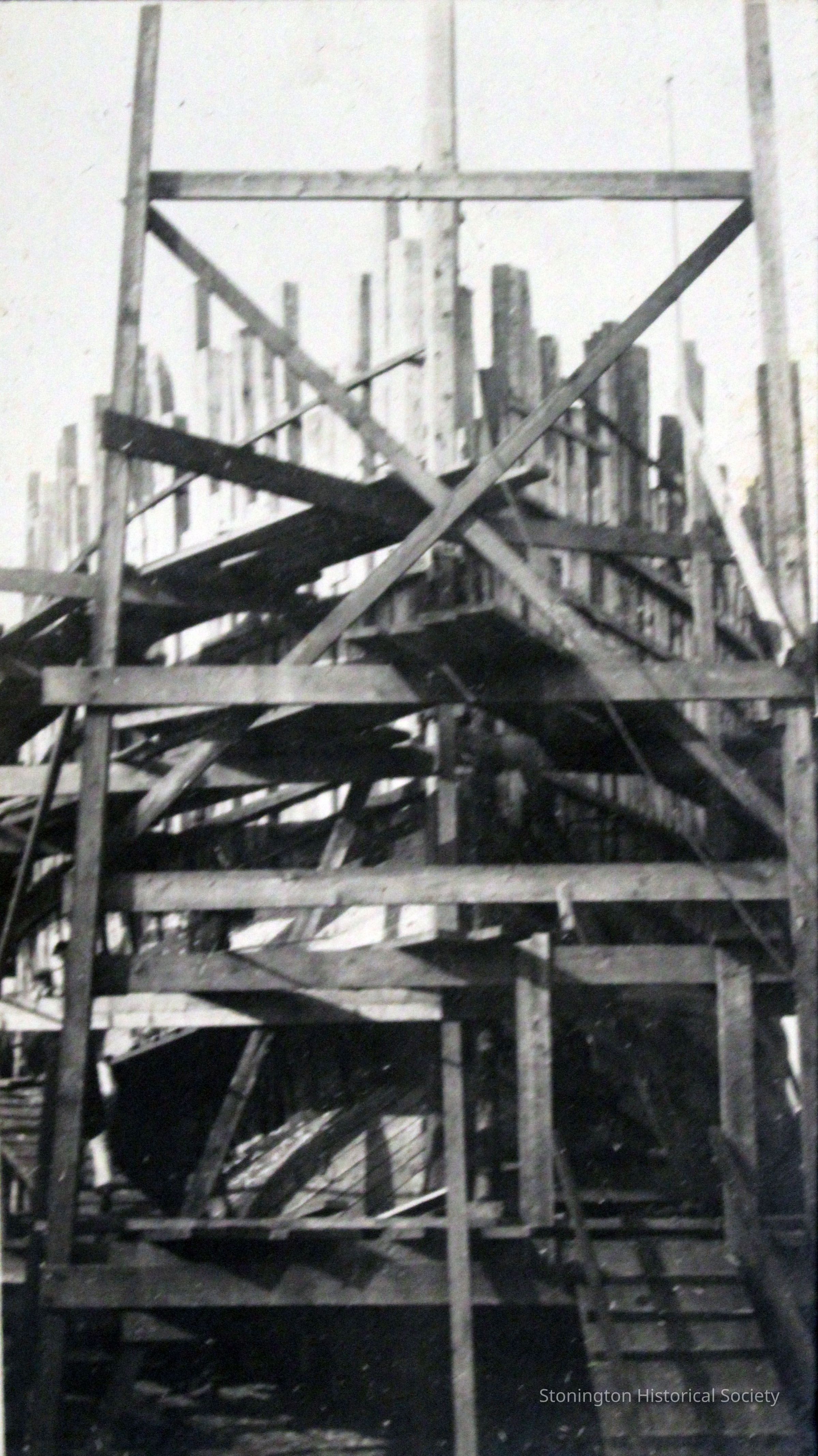 View of the SS Lansing under construction at Stonington dock c.1918. The image shows the hull under construction, and the scaffolding, ladders and braces used to secure the ship as it was worked on. This appears to be the workers entrance at the prow of the ship. The Lansing steamship was rebuilt by the Ship Construction and Trading Company, Inc. of Stonington for the Nafra Company of New York.Made/Created