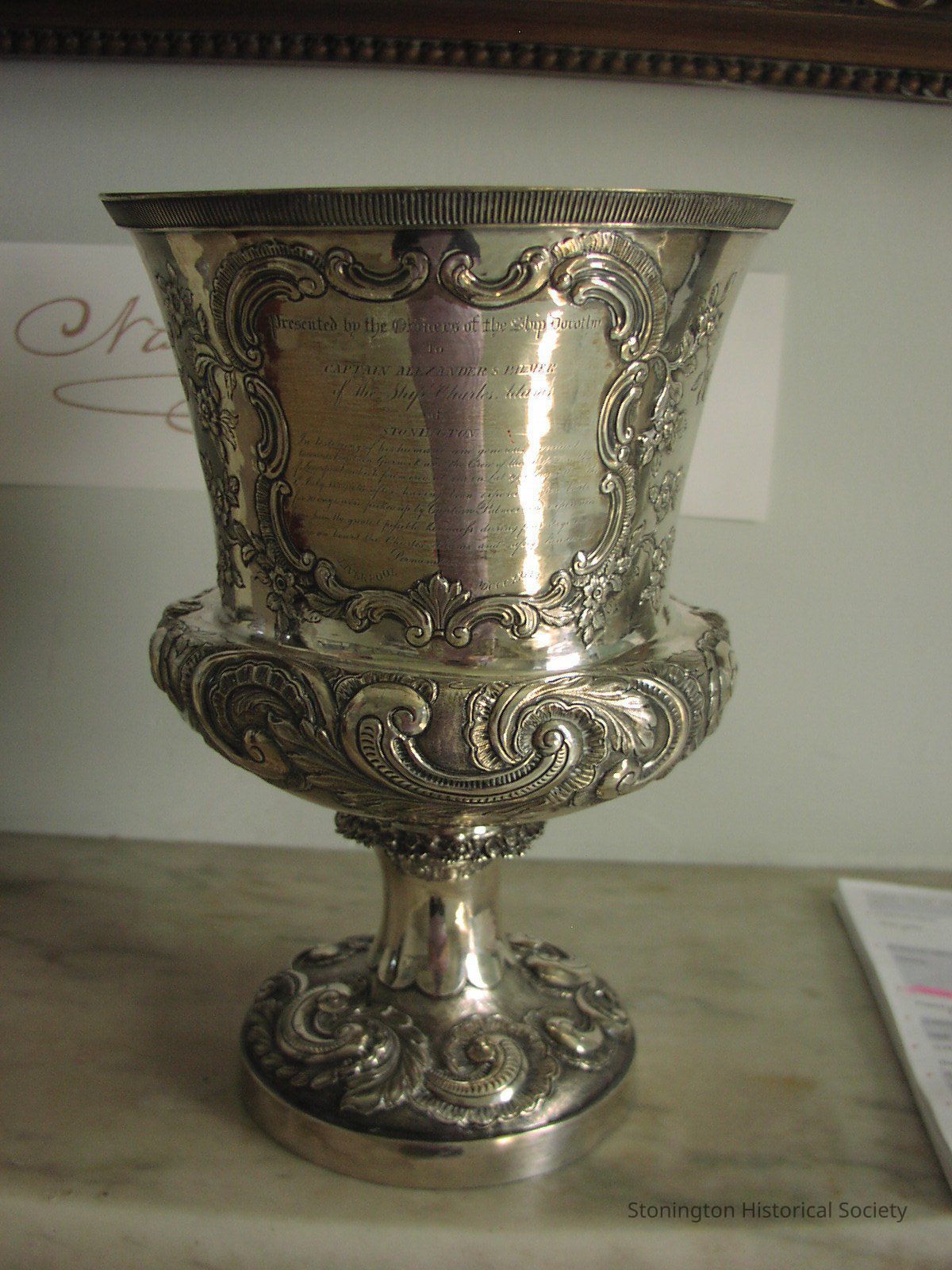 Sterling silver wine cooler, inscribed with a dedication to Alexander Palmer in gratitude by Captain Garnock. Cup has repousse work, acanthus leaf design on base, flowers around inscription.Collection