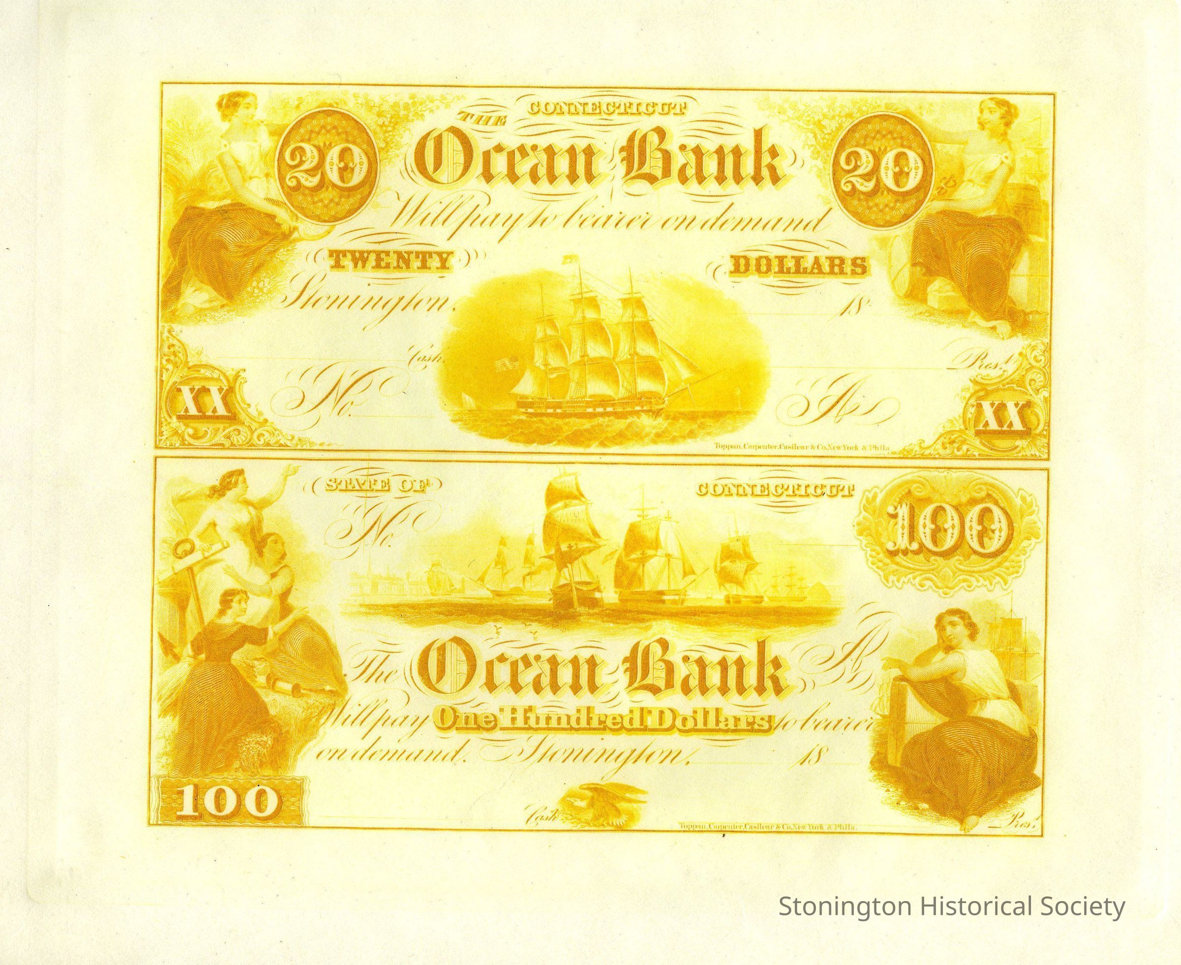 Copy made of bank notes from Ocean bank, $20.00, $100.00 (one each) using engraved plate (see 2002.1001.26) printed in yellow
