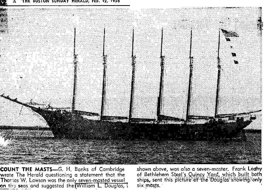 Caption reads: G. H. Banks of Cambridge wrote The Herald questioning a statement that the Thomas W. Lawson was the only seven-masted vessel on the seas and suggested the William L. Douglas, shown above, was also a seven-master. Frank Leahy of Bethlehem Steel's Quincy Yard, which built both ships, sent this picture of the Douglas showing only six masts."Collection
