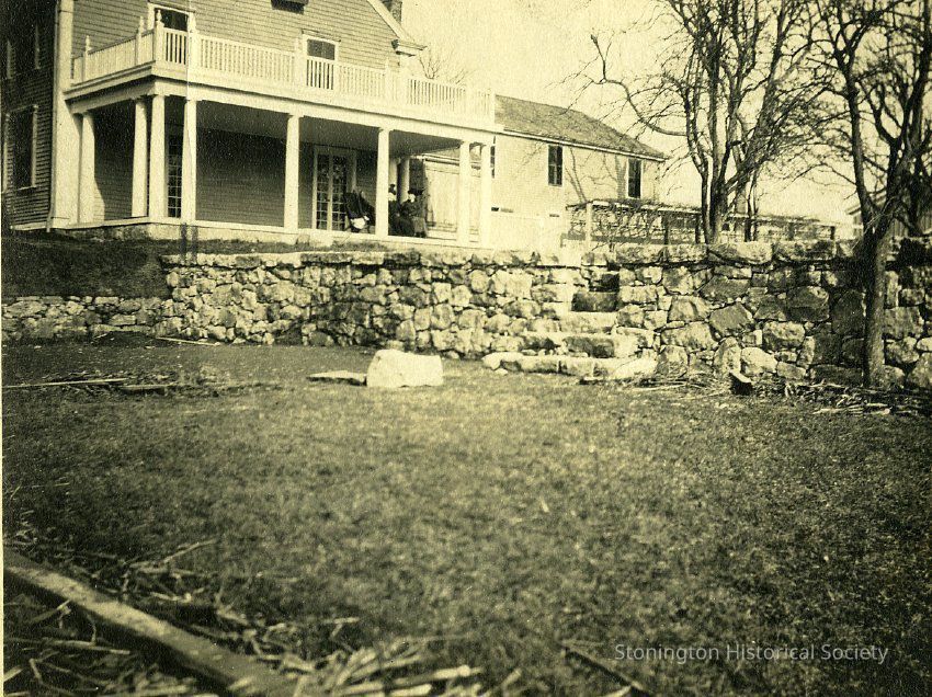 Covered porch at "The Hill," residence at 35 Grand Street, with stone wall on back a pencil drawing of house