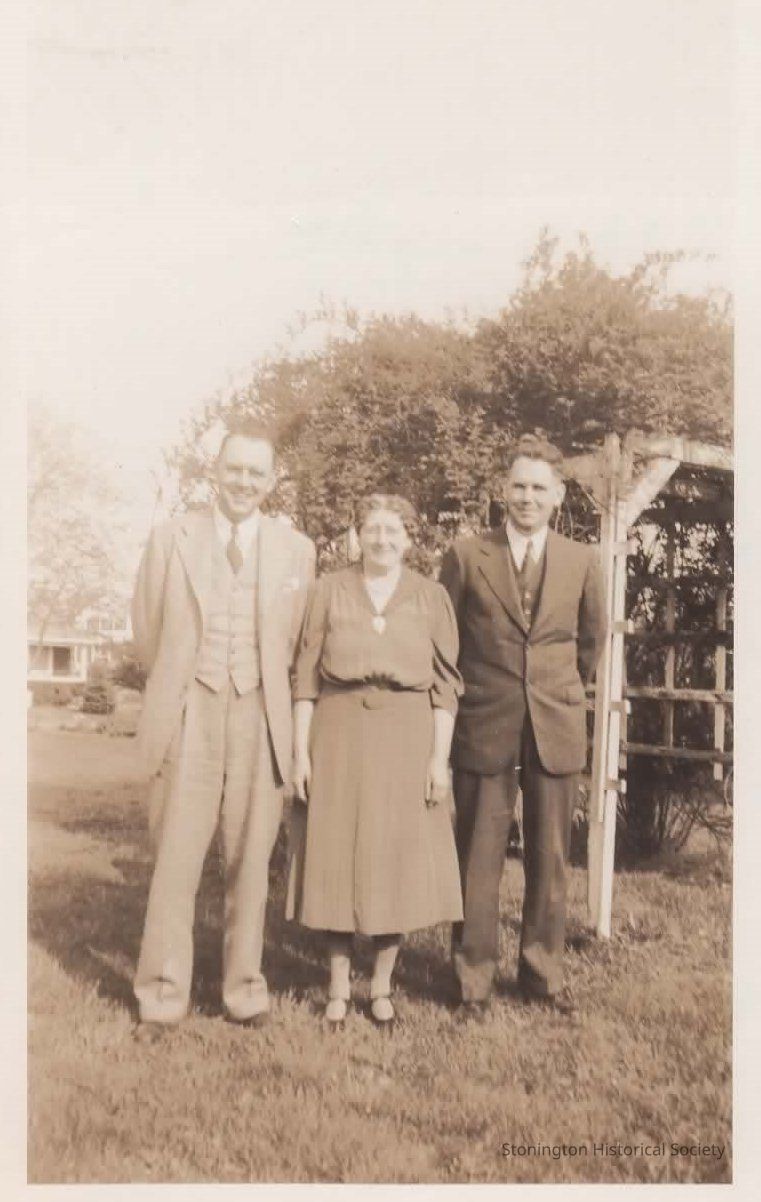 black and white snapshot, Allen, Ruby and Howard Crouch in Mrs. Burdick's yard, May 12, 1942. Taken just before Howard joined the military.Collection