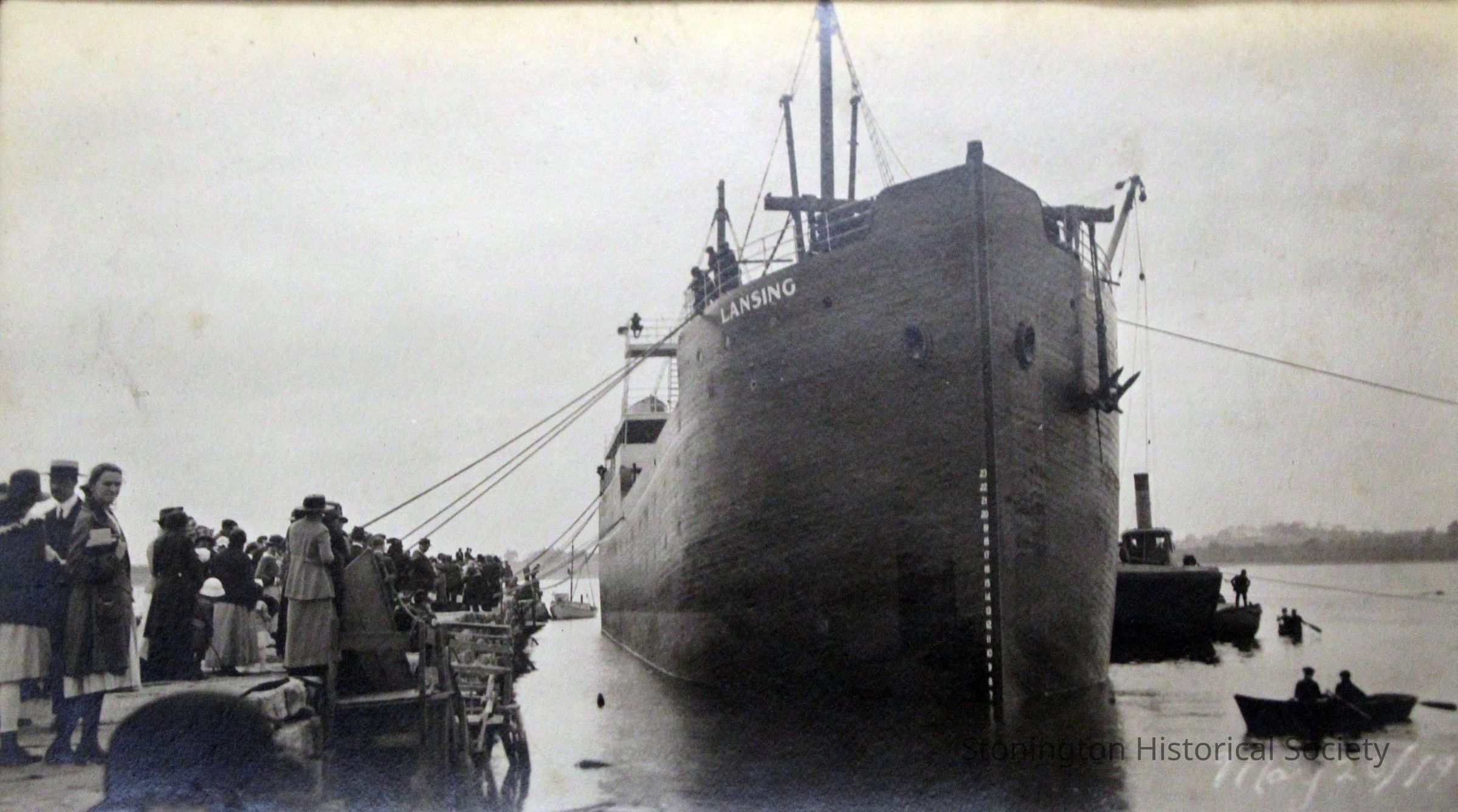 A crowd watches from the docks as the SS Lansing is launched on May 20, 1919. The Lansing steamship was rebuilt by the Ship Construction and Trading Company, Inc. for the Nafra Company of New York.Made/Created