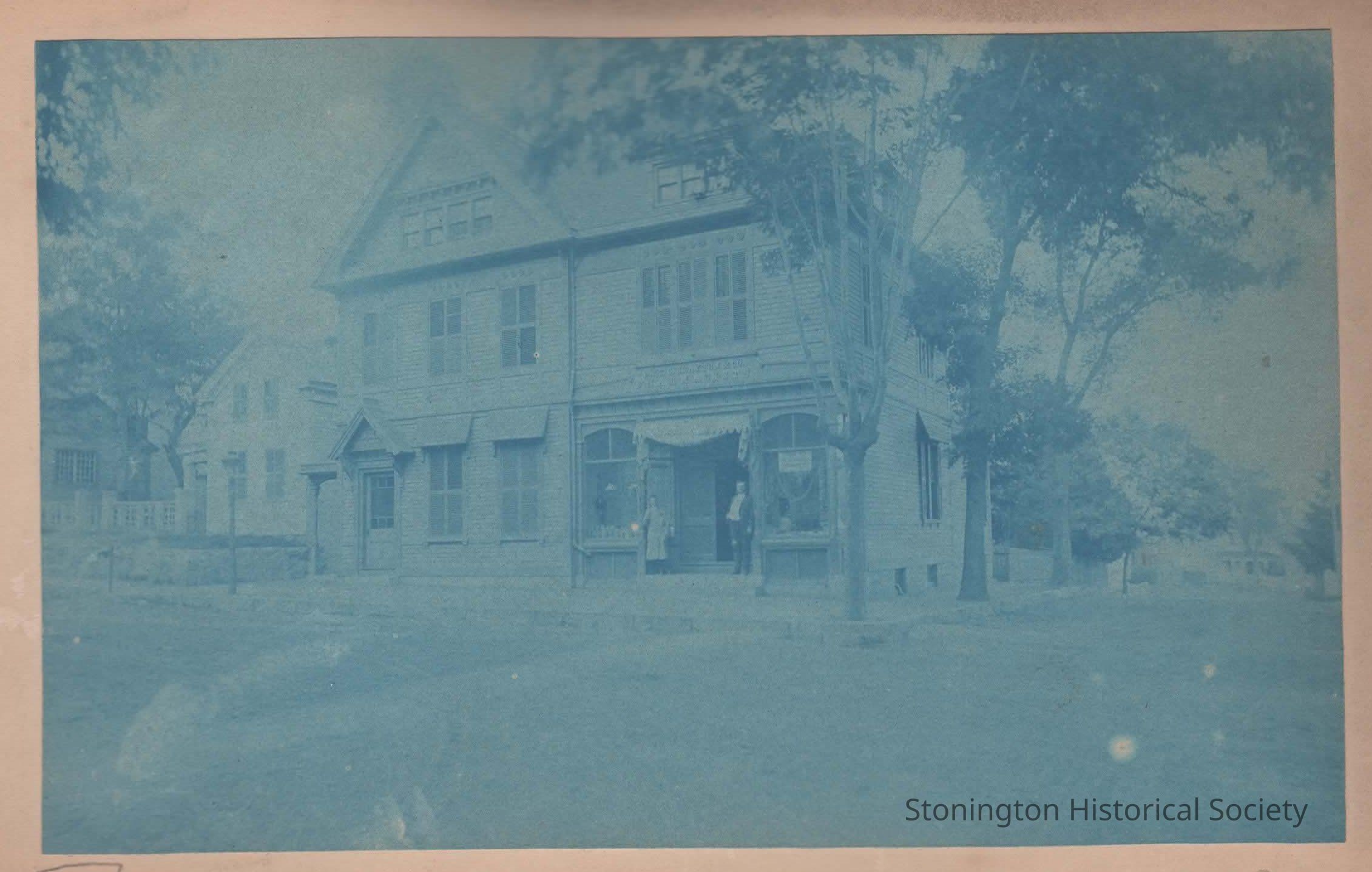 Cyanotype mounted on board, "C.E. Brayton & Co., Pharmacists" at 77 Main Street (at the intersection of Main and High Street) in Stonington BoroughCollection
