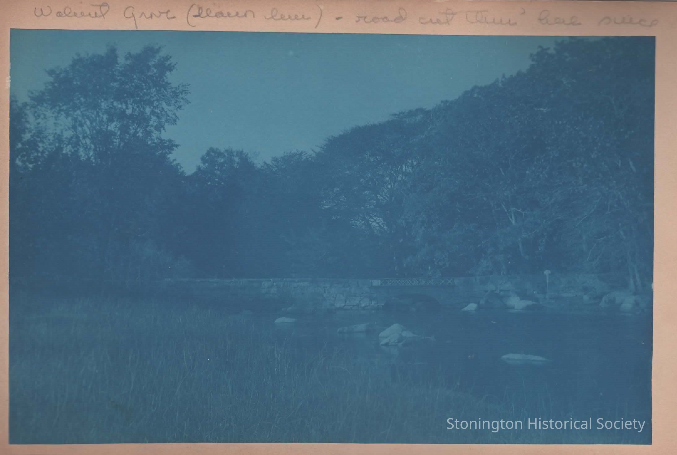 Cyanotype mounted on board, gardens at Walnut Grove, "road cut thru' here since"