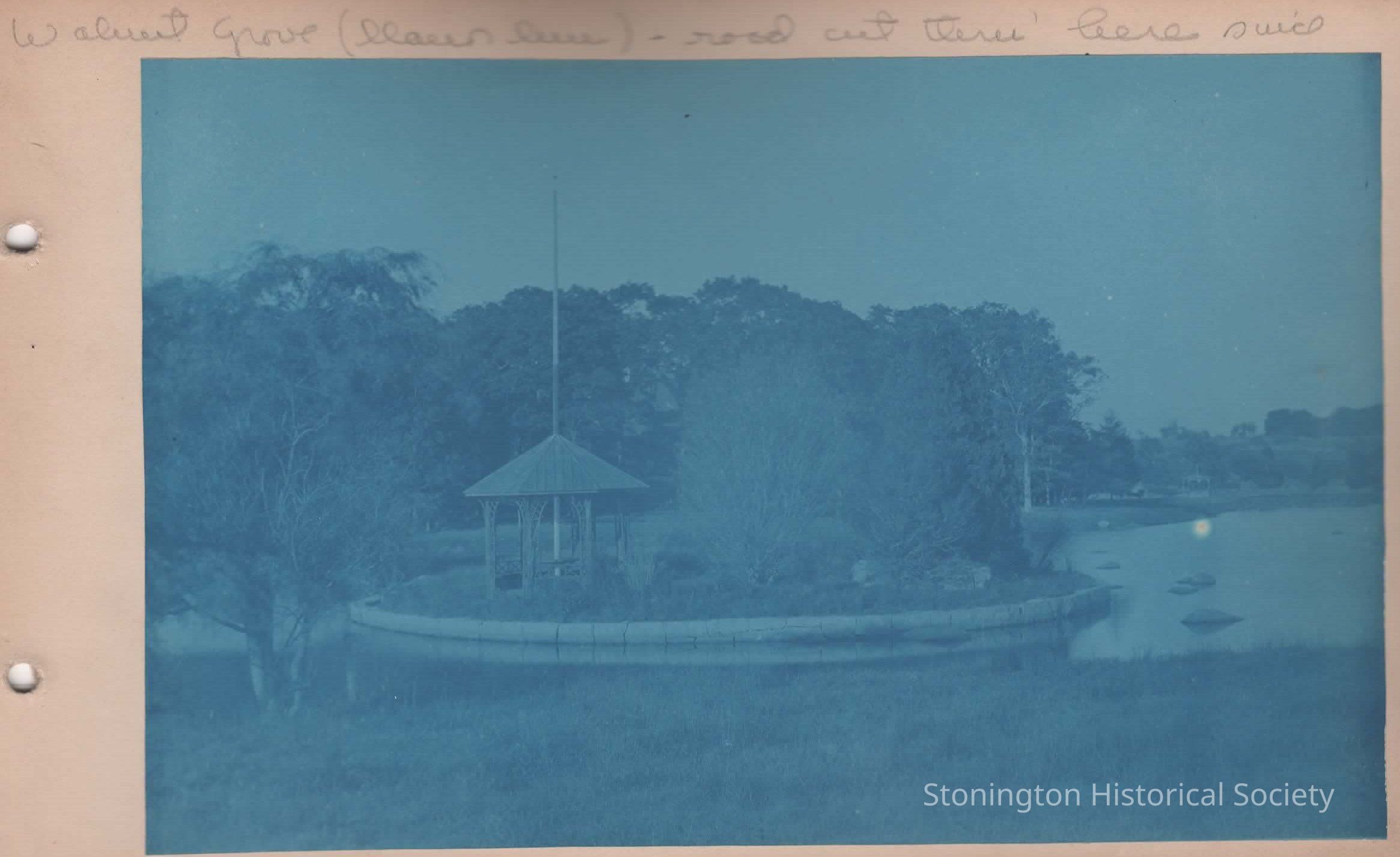 Cyanotype mounted on board, gardens at Walnut Grove, "road cut thru' here since"