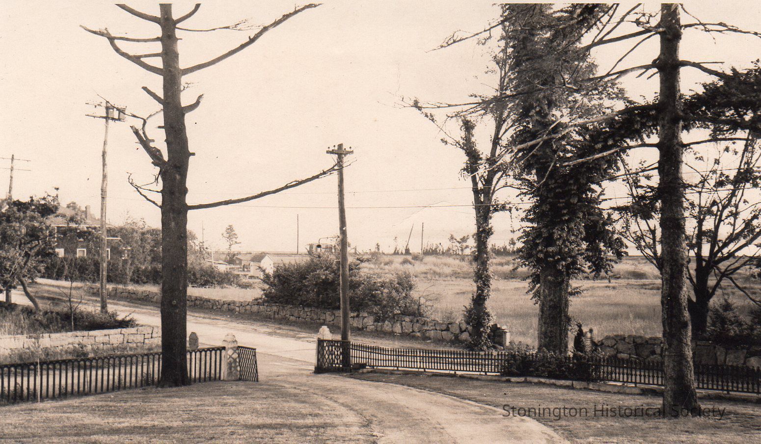 Black and white photograph, view of the driveway of the Palmer House looking towards Lambert's Cove following the 1938 Hurricane.