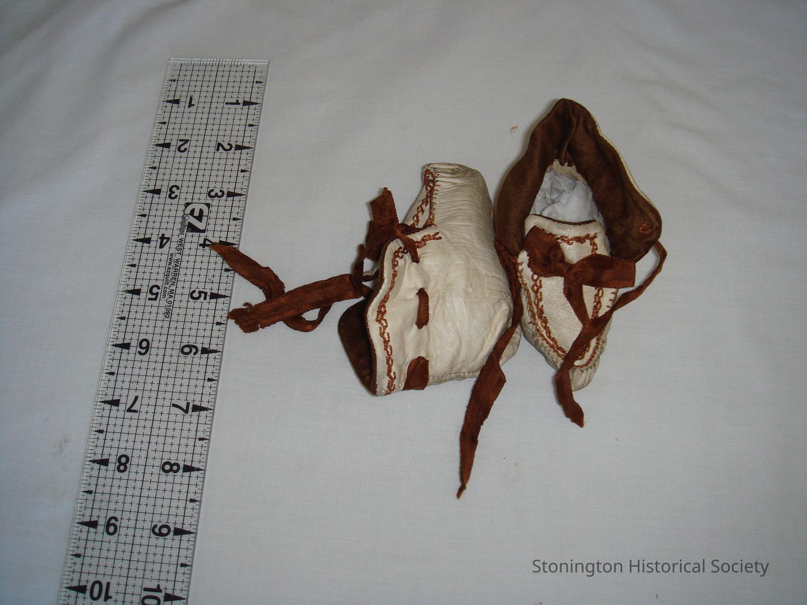 infants white leather moccasin decorative brown hand stitching brown ribbon tie