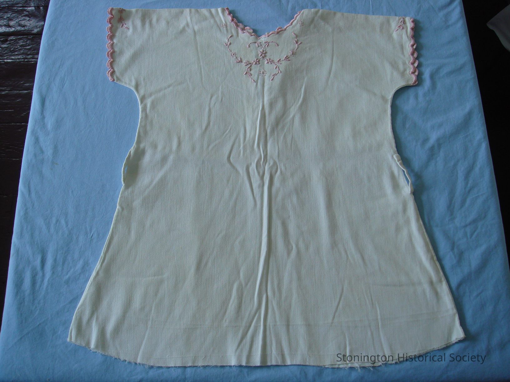 machine embroidered sleeve and neck edges with pink embroidered design on upper front and top of sleeves