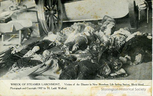 Wreck of Steamer "Larchmont" Feb. 11, 1907. Victims of the disaster in New Shoreham Life Saving Station, Block Island. (tape on bottom right)