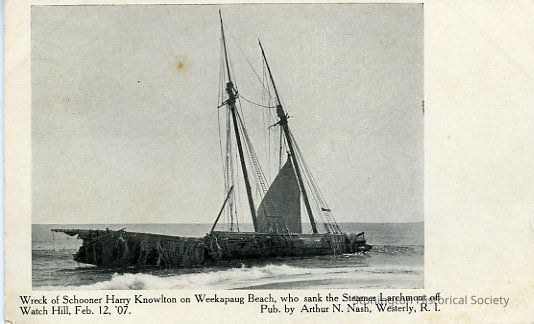 Wreck of Schooner "Harry Knowlton" on Weekapaug Beach, which sank the Steamer "Larchmont" off of Watch Hill, Feb. 12, 1907