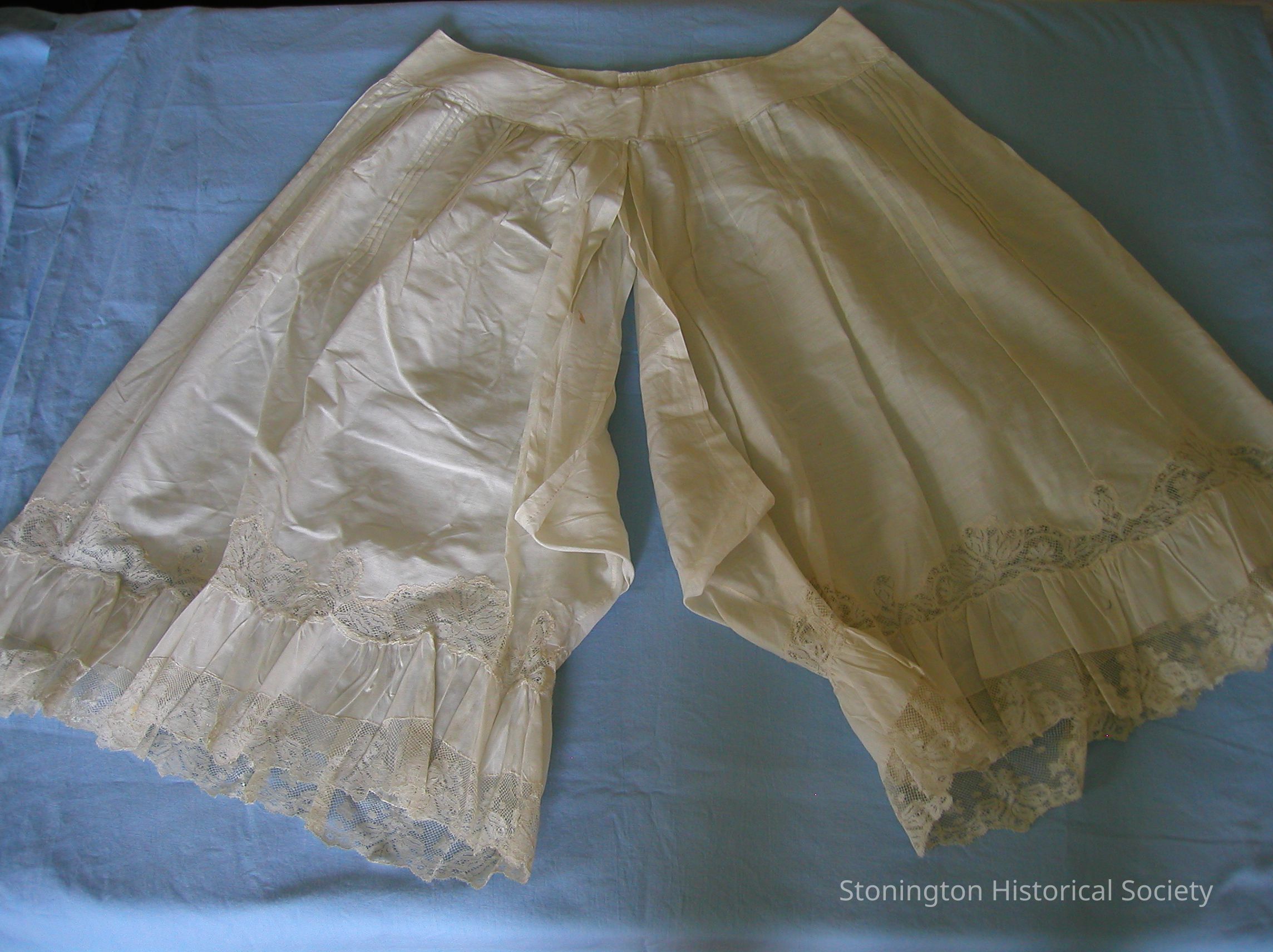 b-corset cover- lace neckline on front bodice only, 6/8 inch ribbon threaded one inch below lace trim, 5 button closure in front, gathered at waist, pintucks at waist line and center back