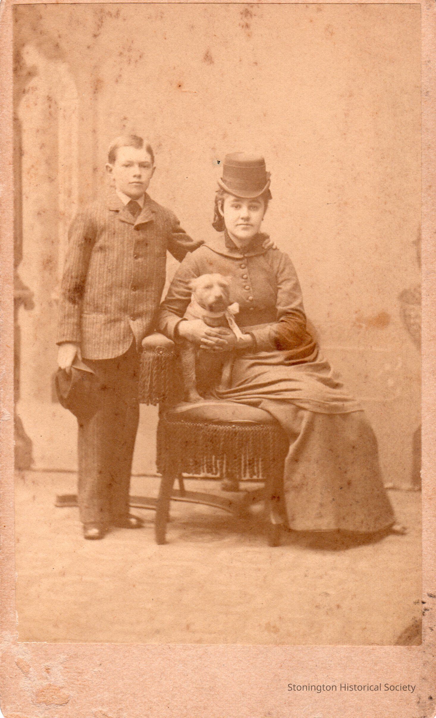 Photograph mounted on board, portrait of woman with boy and dog, back reads "Aunt Dolly from Adelaide, Christmas 1879" taken by Scholfield Bros., Mystic Bridge, Conn.Collection