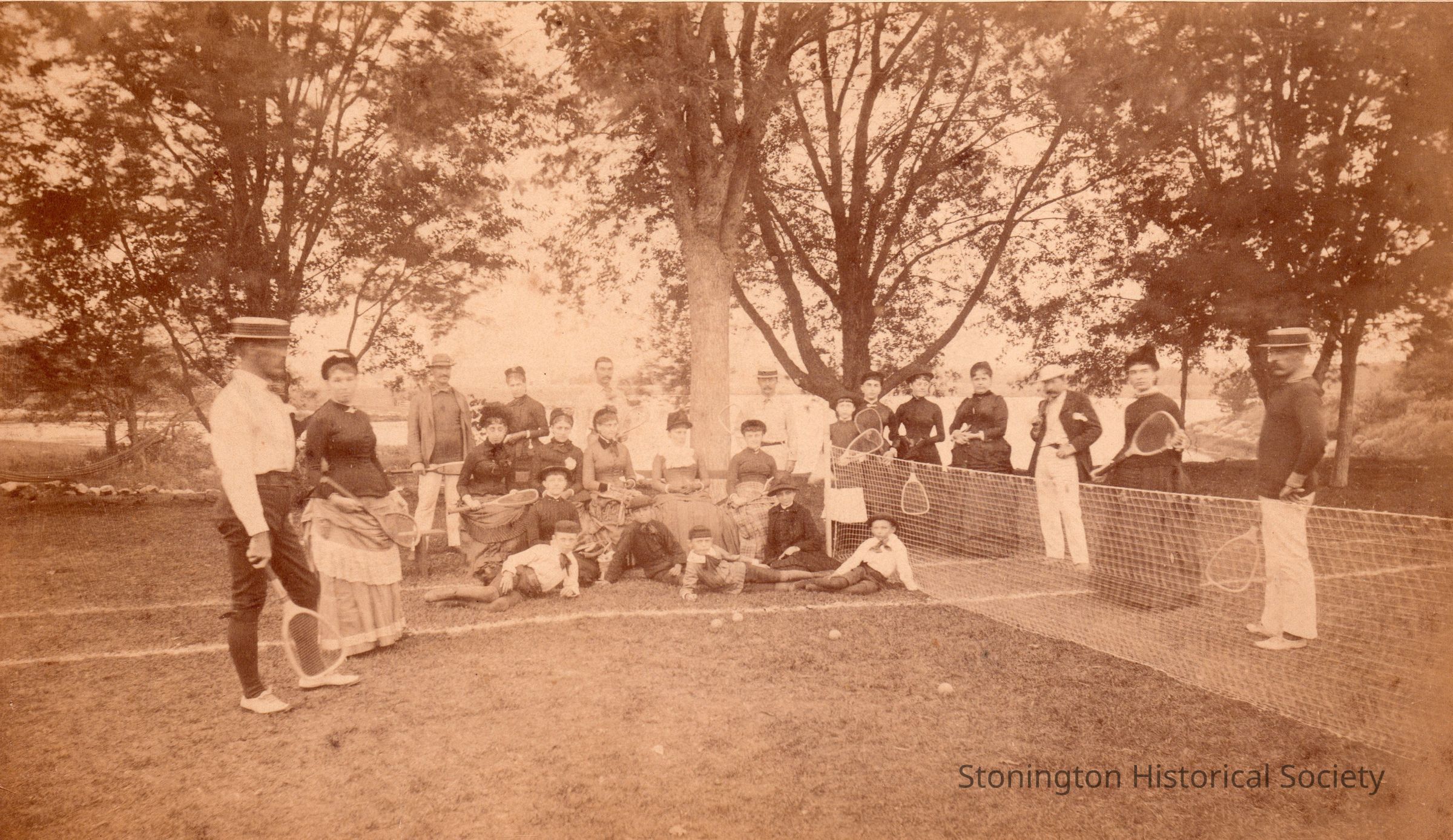 Sepia photograph, a group assembled on the tennis court at Cove Lawn, c. 1890. Identified on the back, from right to left: "Sarah Holmes, Mrs. George A. Adee, Maria Burnham, Elise Holmes, Nellie Adee, Louise Trumbull, Hannah Stanton, Caddie Smith, Mrs. Edward Finney, Grace Stanton, Maria Trumbull, Mrs. Richard Loper, Mr. J. Warren Stanton, Charles P. Palmer, George A. Adee, Louis L. Palmer, Alexander S. Palmer, Jr., Nathaniel P. Stanton. Children seated in front: R.F. Loper Jr., Emmeline Hunter, Charles Adee, Alexander Loper, George Adee."