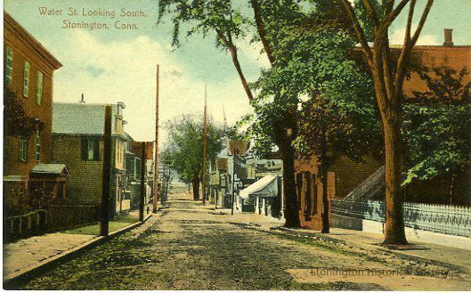 Water Street looking south from High Street. Note the rail crossing gates in middle of card