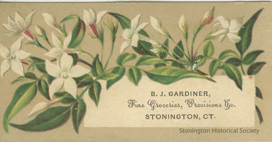 Trading card for B. J. Gardiner, Fine Groceries, Provisions etc. Stonington, CT. with flowering branch along border
