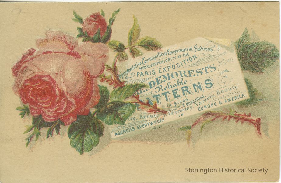 Card showing business card for Mme. Demorest's Reliable Patterns with rose through it. Reverse is advertisement for Jerome S. Anderson and his businesses