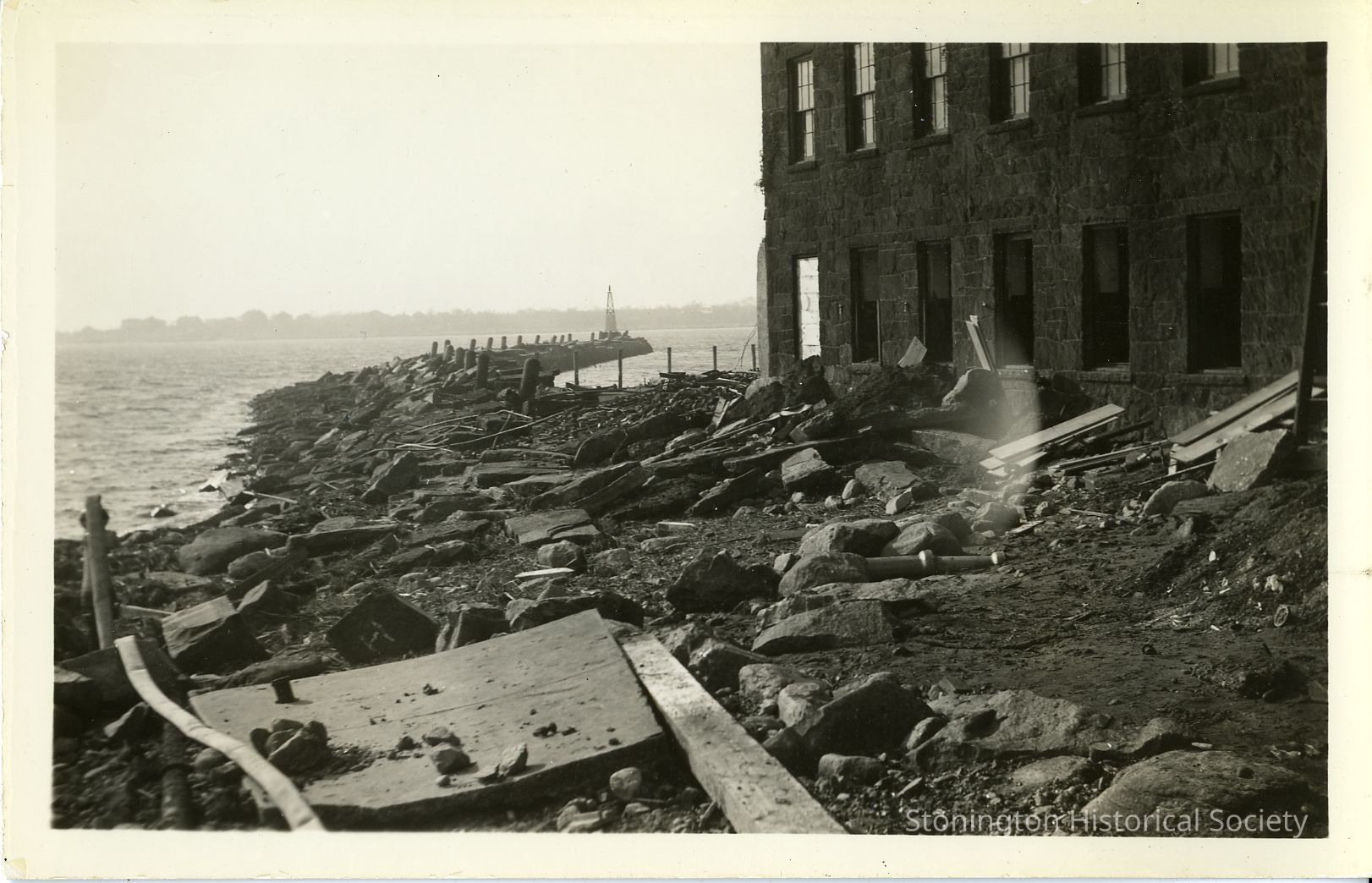 Back (harborside) of Atwood Machine Co. showing destruction View also shows the Atwood breakwater