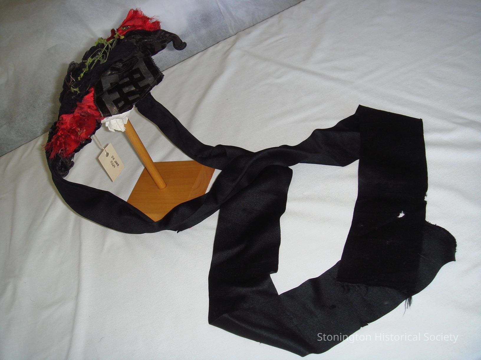 decorated with red silk flowers, black cepe and voided velvet ribbon