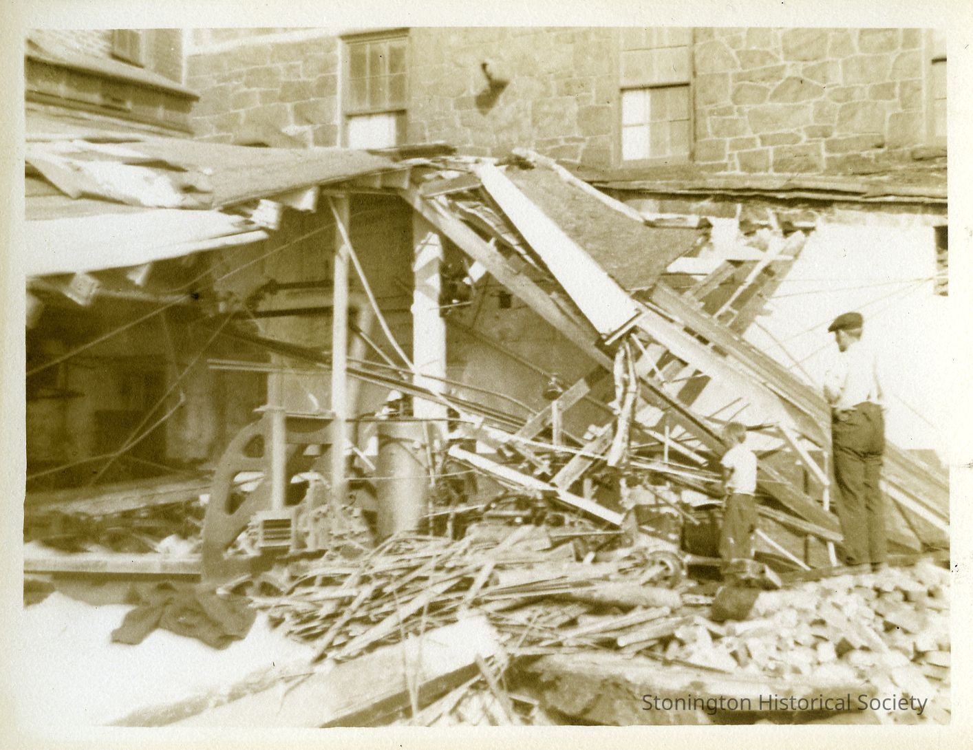 Back (harborside) of Atwood Machine Co. showing destruction with men looking at damage