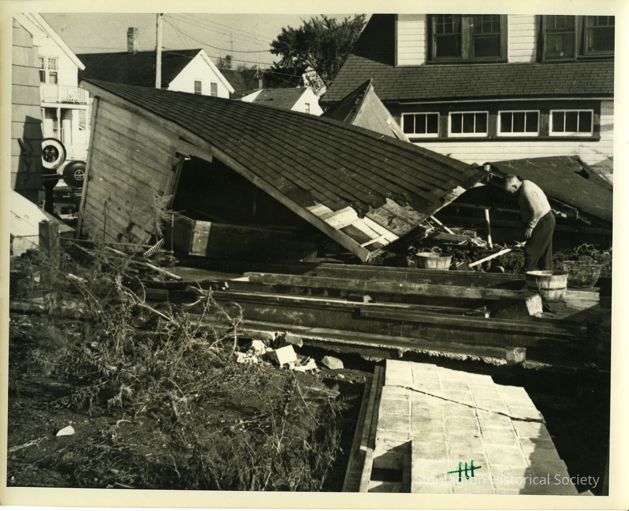 Man working on debris of demolished house with baskets; a rake to left side of photo