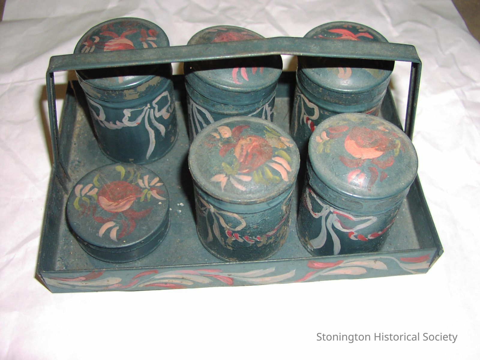Small tin tray with handle holding five tall canisters and one flat canister. All of it is painted blue, canisers have roses of pink on the lids, and bows and swags around the sides. Pink and white decortion on the tray.Collection