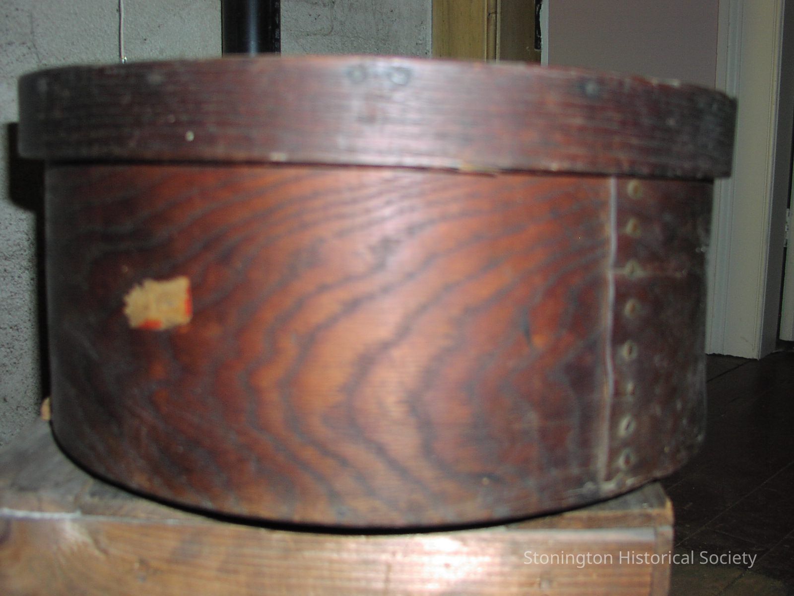Large, dark wooden bandbox. Box lid and sides are secured with round-head nails. Bottom is made of two pieces.