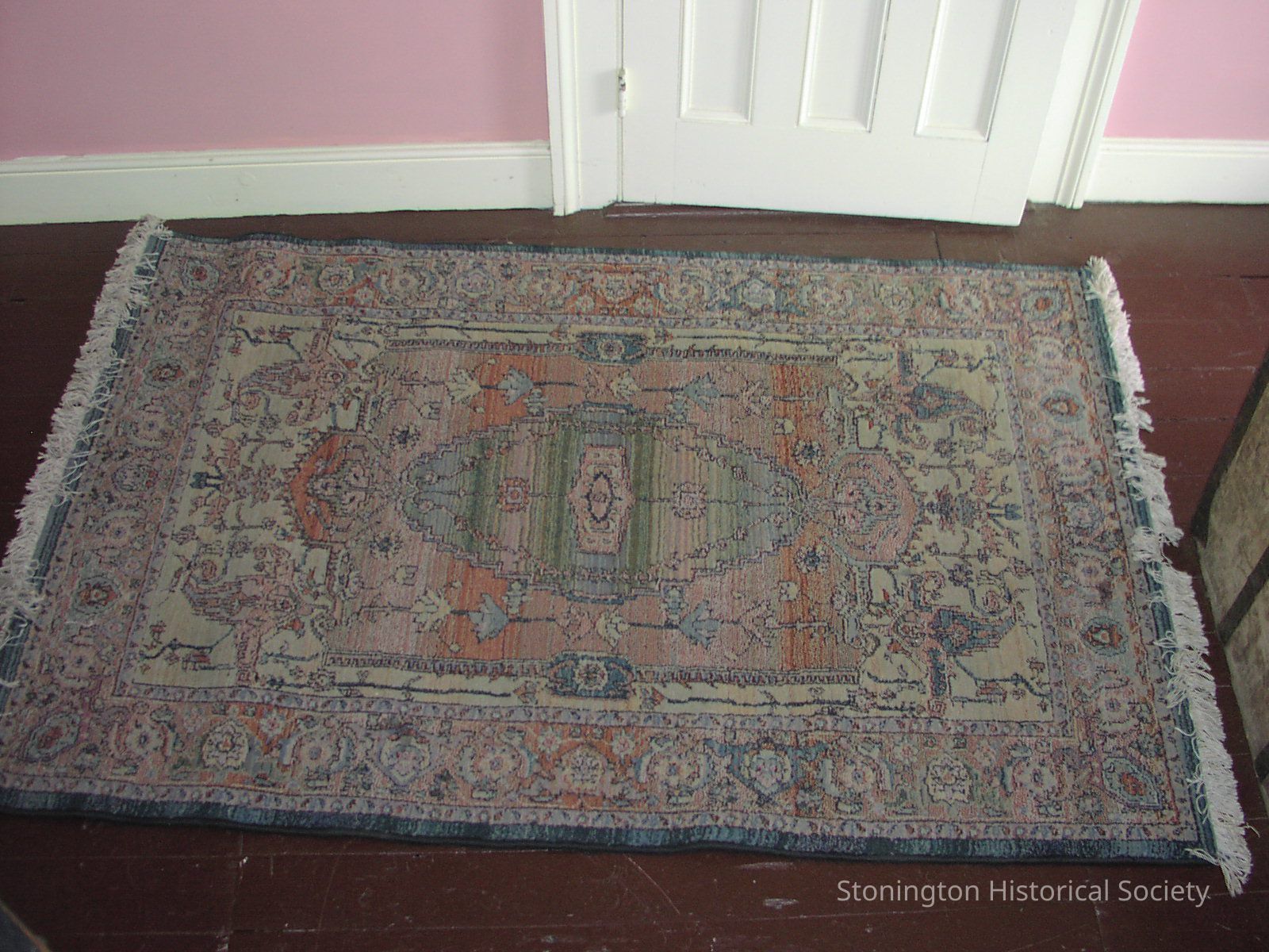Contemporary machine made '"Oriental" rug. Late 20th century, Egyptian. Muted colors of red, blue, orange, tan, rose and gray on tan ground. Maker was Gabbeh and the rug is made of olefin.Collection