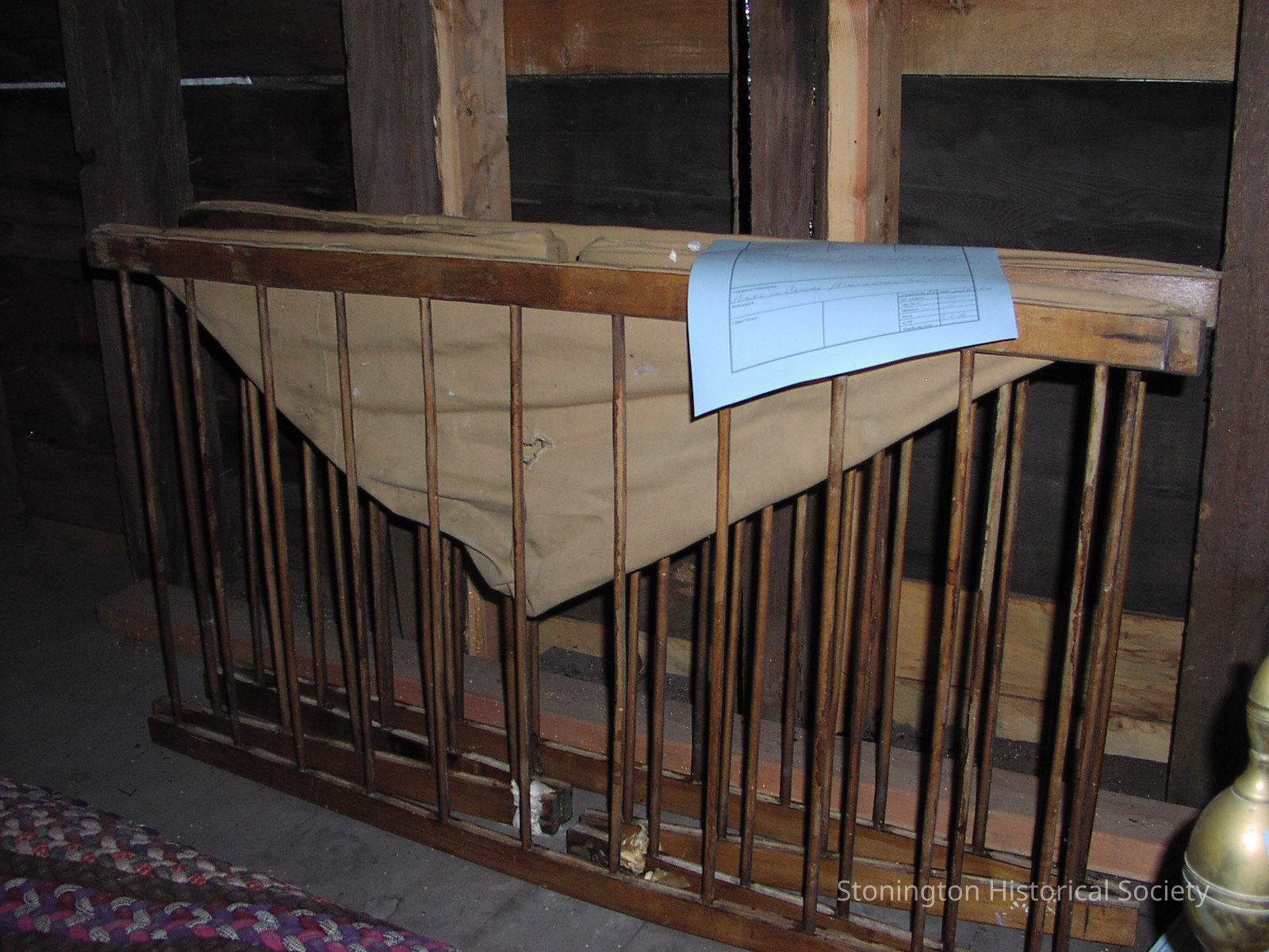 Child's collapsable playpen with canvas floor attached with tacks. Wooden bars 3 1/2 inches apart. Metal hinges and hooks.