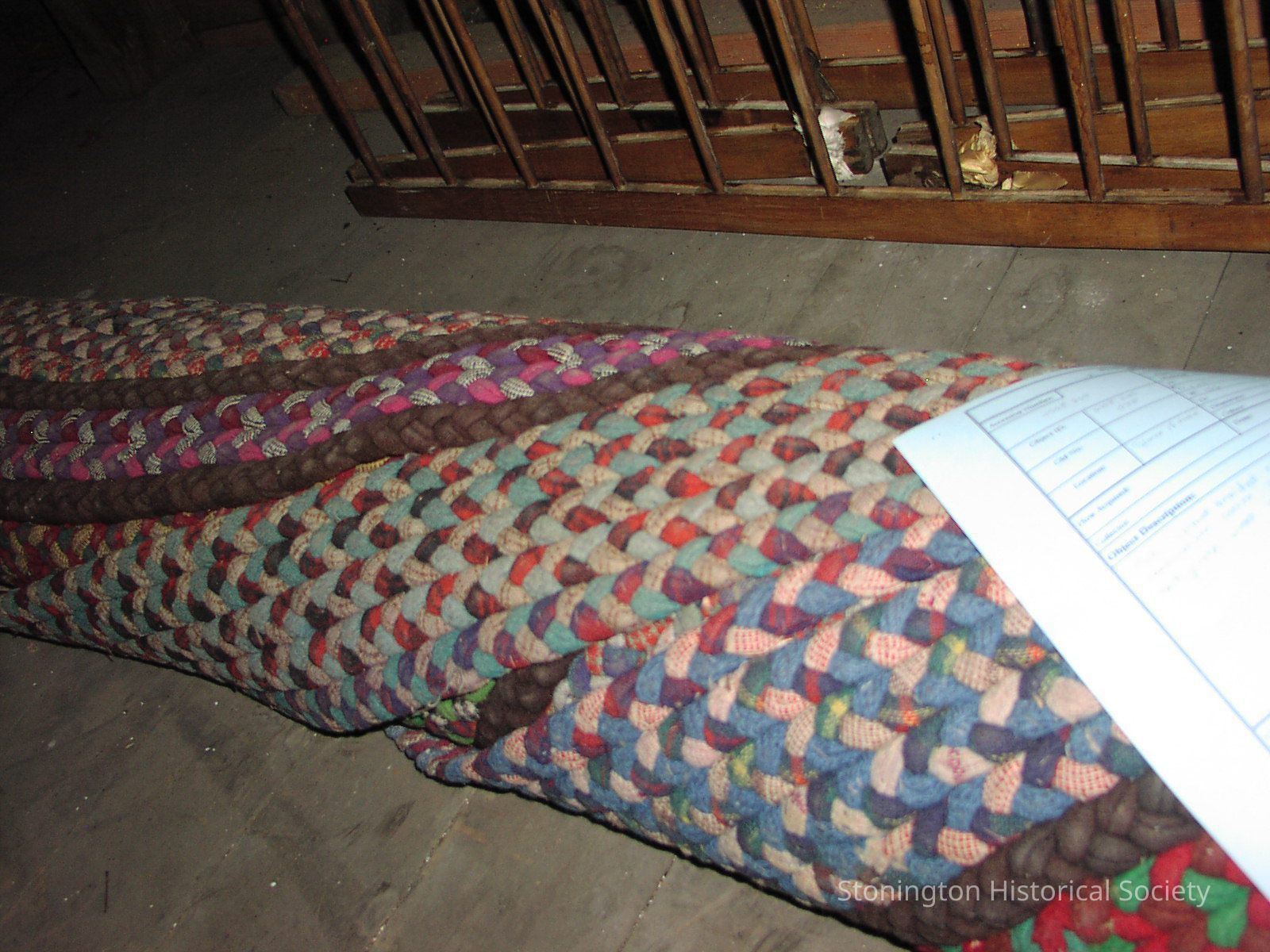 Mulit-colored braided rug. Concentric circles of different color combinations. Center piece with five red flowers, yellow centers and green vines on a tan background.