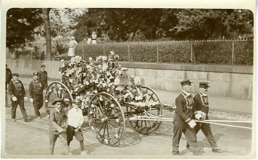 Neptune Hose Company #1 marching with flower- decorated pumper. Chain link fence in background. This is on Water Street entering the borough going towards the Point next to the Loper mansion which became the Post Office site.