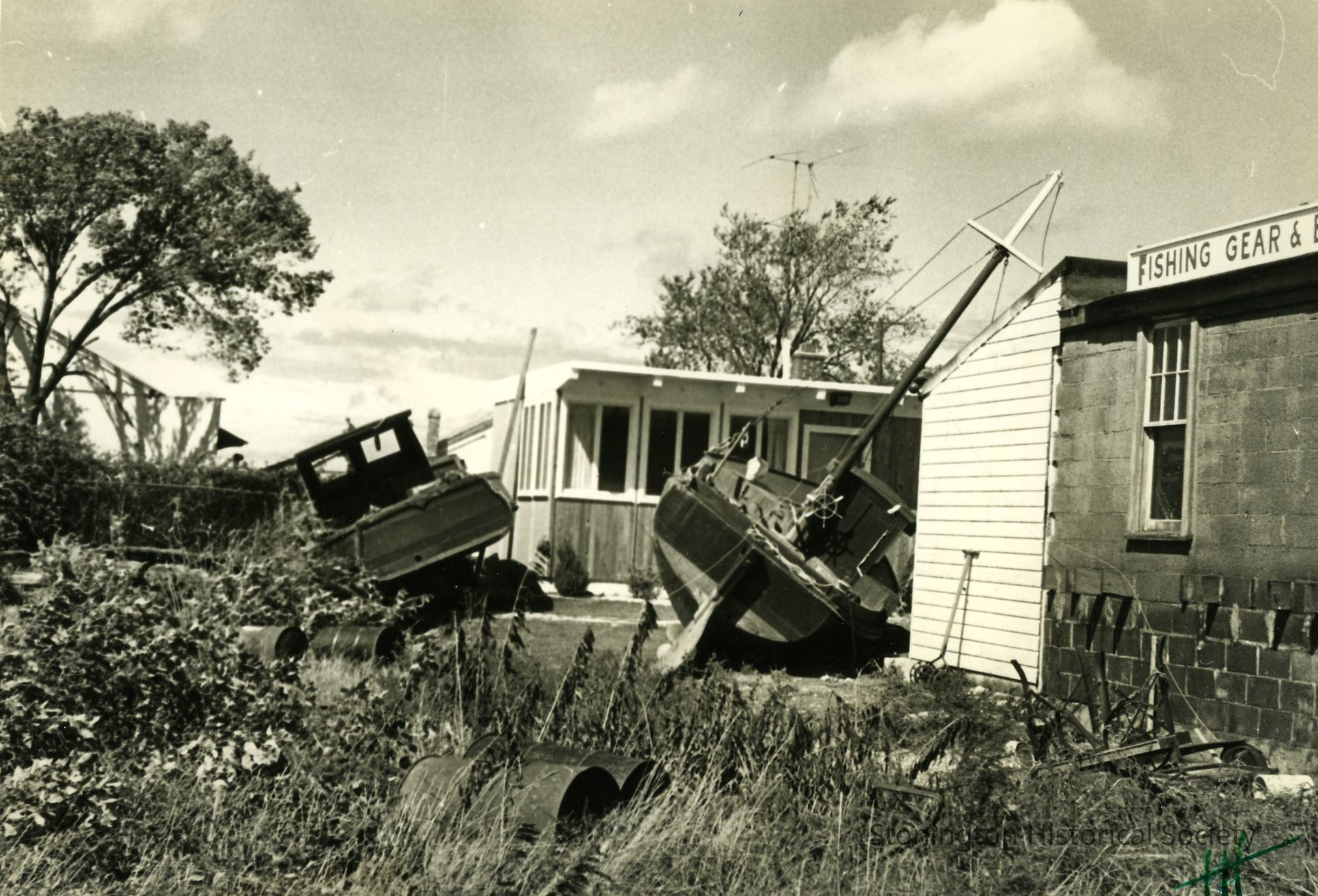 Boats washed up against buildings, one with sign "Fishing Gear & Bo..."