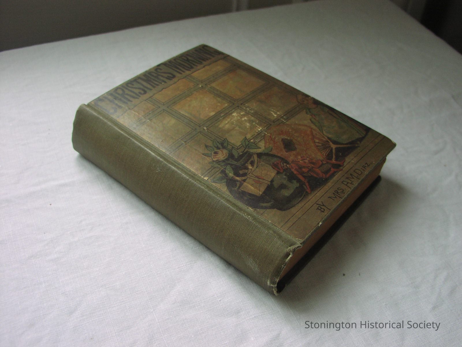 "Christmas Morning" by Mrs. A. M. Diaz, published by D. Lothrop & Company, Boston, 1880. Olive green book cover, illustrated, depicting a window sill with 2 dolls, a fan and a vase.