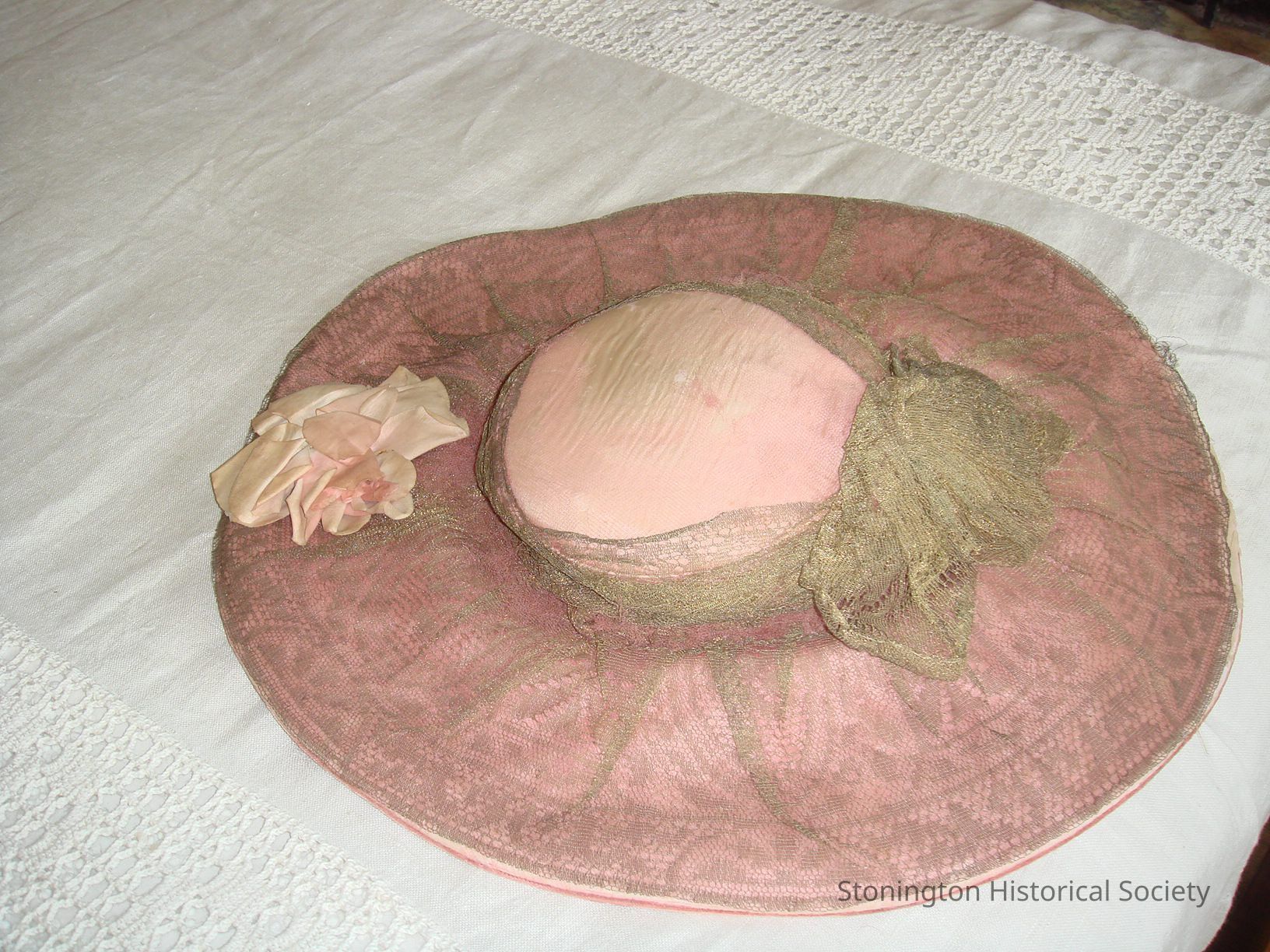 top of hat layered with pink silk, pink netting and gold/tan machine made lace