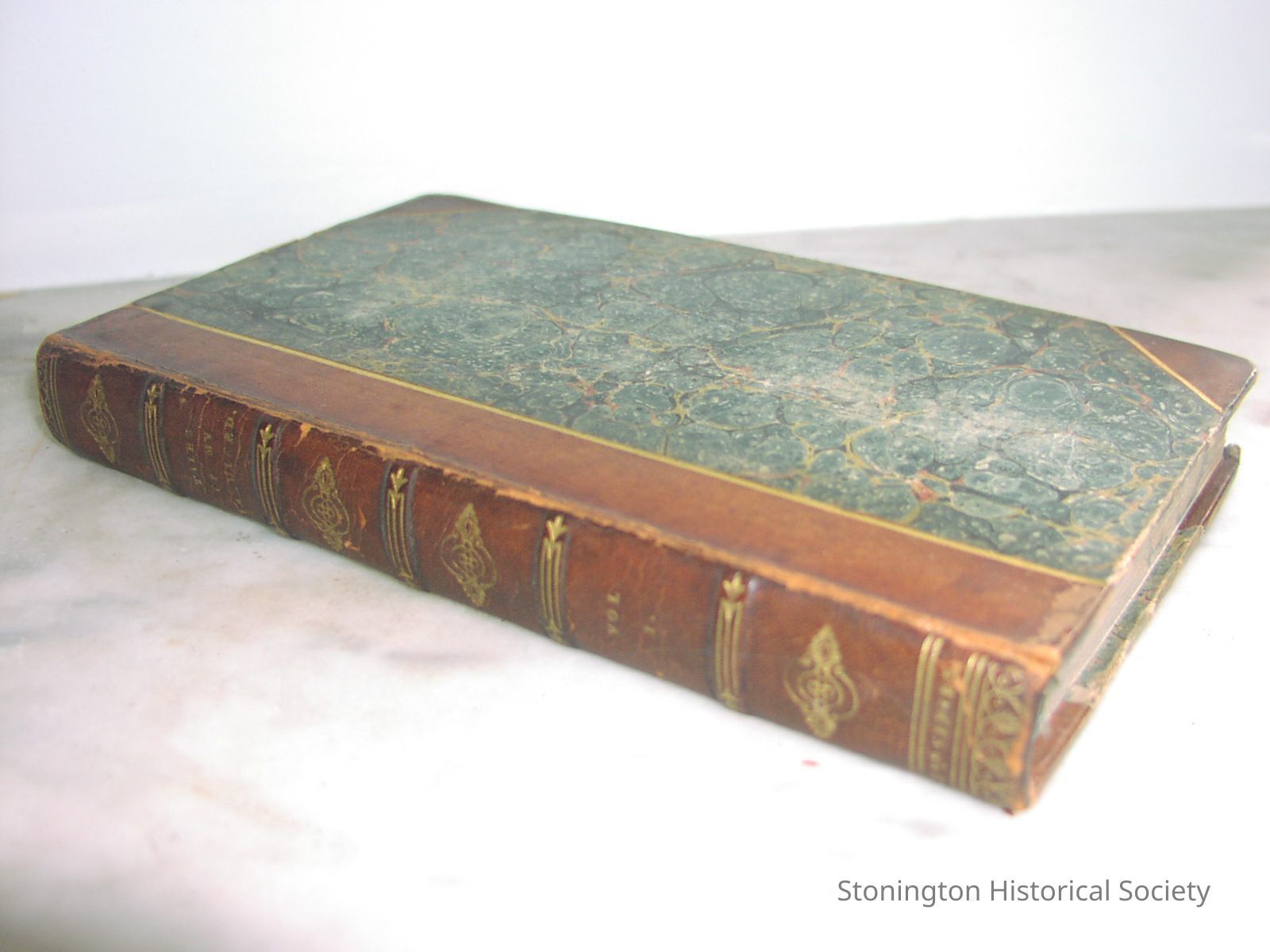 "Tales of My Landlord: Volume I" collected and arranged by Jedidiah Cleishbotham, published by Archibald Constance and Co., Edinburgh, 1819. Dark green, black, red and gold marbled book cover, brown spine with gold lettering and embellishments.