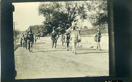 Group of people dressed as Indians with chain link fence on left. This is on Water Street entering the borough going towards the Point next to the Loper mansion which later became the Post Office site.