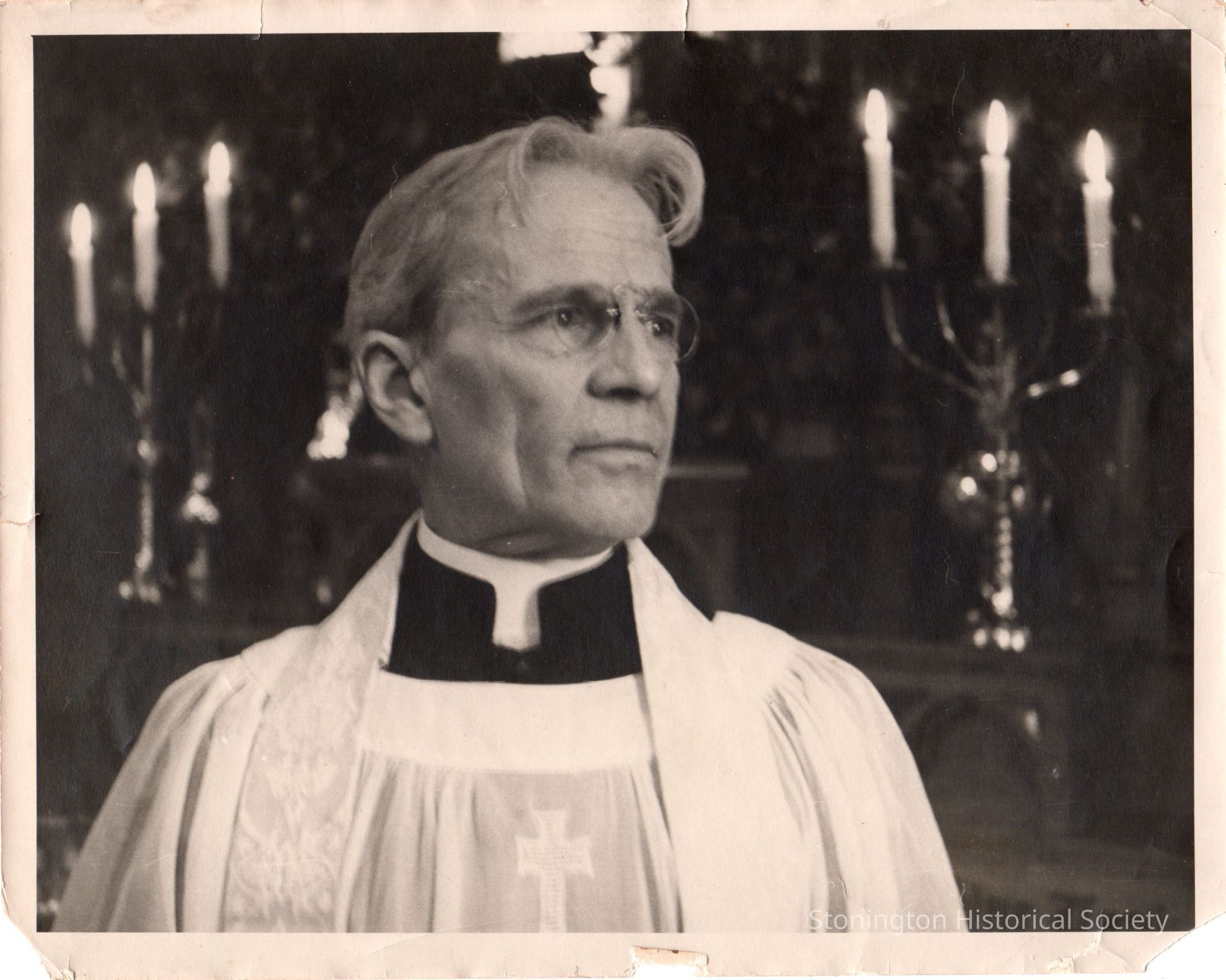 black and white photograph, Archdeacon William Frederick Williams, Calvary Church, handwritten on back: "Given to Abby, Elizabeth, Harriet & Nat. by Mrs. Williams, Aug. 1946. Archdeacon William Frederick Williams of Calvary Church, Stonington - a small but mighty man! Full of love for all his parishioners and the rest of the world" - H.B.B.Collection